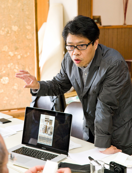 僕の「三木組」は、福岡のデザイナー武永茂久さん、石田文明さん、前崎成一さんと、コピーライター長畑一志さんの全員で5人です。クライアント訪問前日に自己紹介もそこそこに、いきなりの濃い打ち合わせ。僕のリードで企業分析をしながらのブランディングの道程の整理。そして、仮説を立てての戦略会議へと。3時間近い会議の密度の濃いこと。頭がフラフラになりながらも僕はその場に居残り、教育委員会のメンバーと2時間近い会議が続きます。日曜日というのに…。そして、全員が合流して食事をしながらも話の流れは今回のプロジェクトへと広がっていきます。2次会、3次会と進み終了は午前2時を軽く回っています。翌日のクライアントとの本番でも5時間以上の長丁場。僕は、その間ずっと話し続けながら企業の悩みや問題点を洗い出し、プロジェクト全体の骨格を組み立てていかねばなりません。と、いうかこの初めてのディスカッションが極めて大事で、企業との信頼感や進むべき指針を立てておかないと、次のステップに進めません。取材、問題点の整理、コンセプトを見つけ出すためのキーワードの創出などなど、話し合うことでデザインの骨格を組み立てていきます。まず、商品というモノを取り巻く「事(コト)」を浮き彫りにしていきます。そして、その企業の魅力やポテンシャルを生かしたその企業でしか出来ない立ち位置、「場(バ)」を見つけ出します。