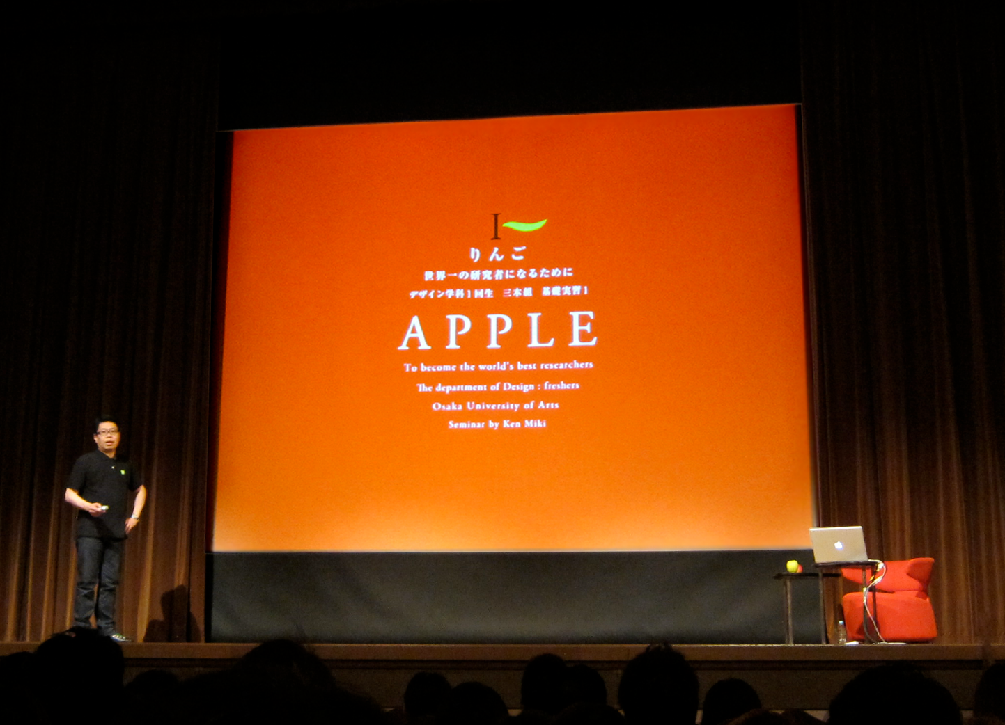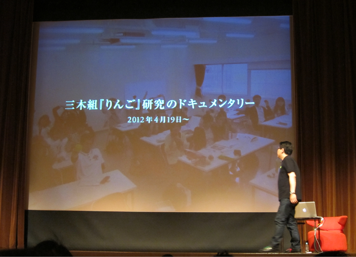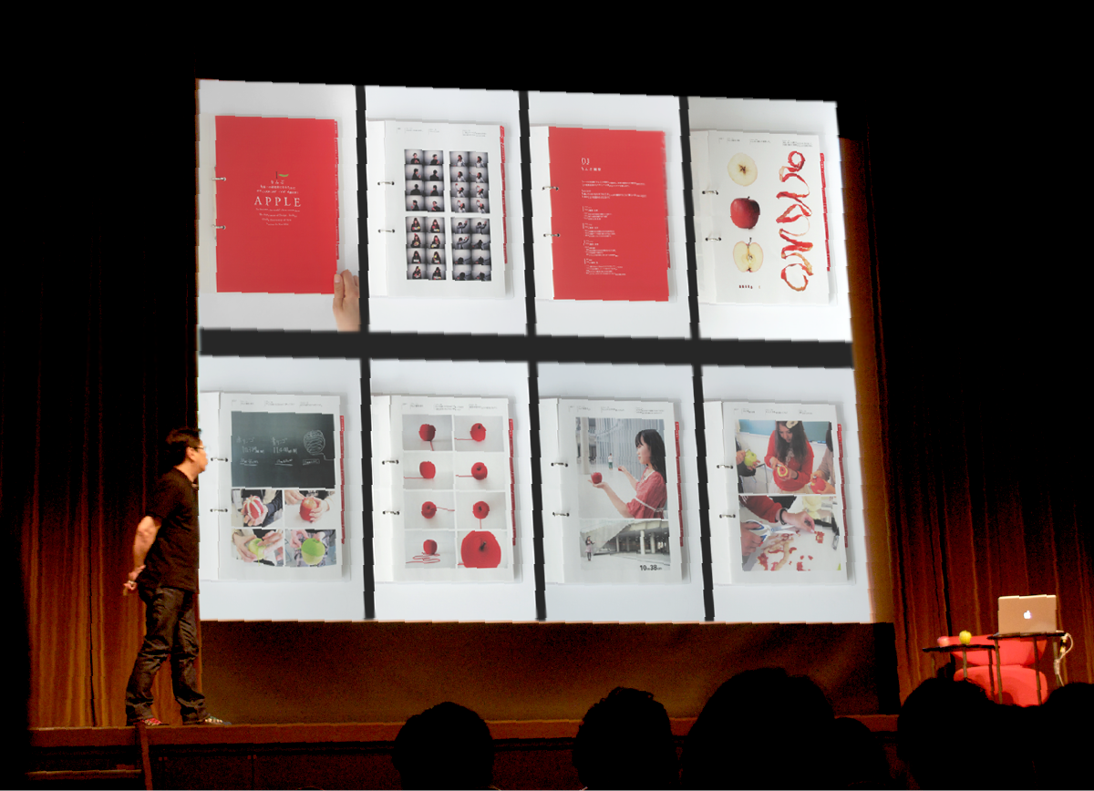 大学に着任が決まって以来「りんご」を題材にする「APPLE」という教育メソッドについては、しっかりと組み立てていましたので「なんとかなるかも」と、お引き受けしてみましたが、リアリティのある学生作品が講演までにどれだけ組み込むことができるかが課題でした。前日の授業の様子をスライドに組み込むという離れ業で、なんとか講演にこぎつけることができました。みなさん、講演依頼は、できるだけ早めに…と願う今日この頃です。