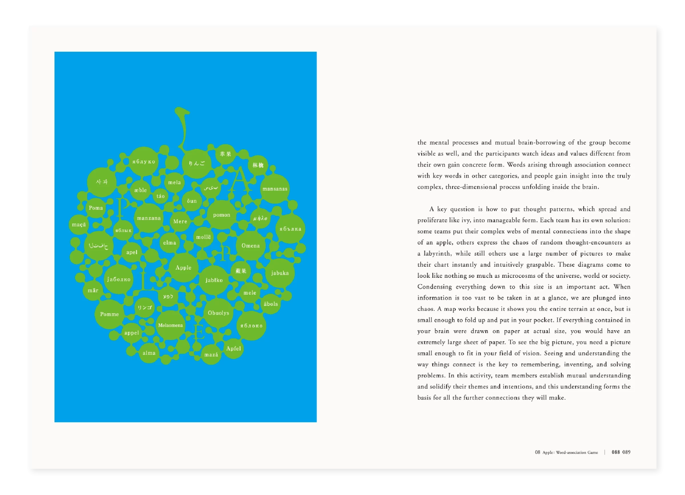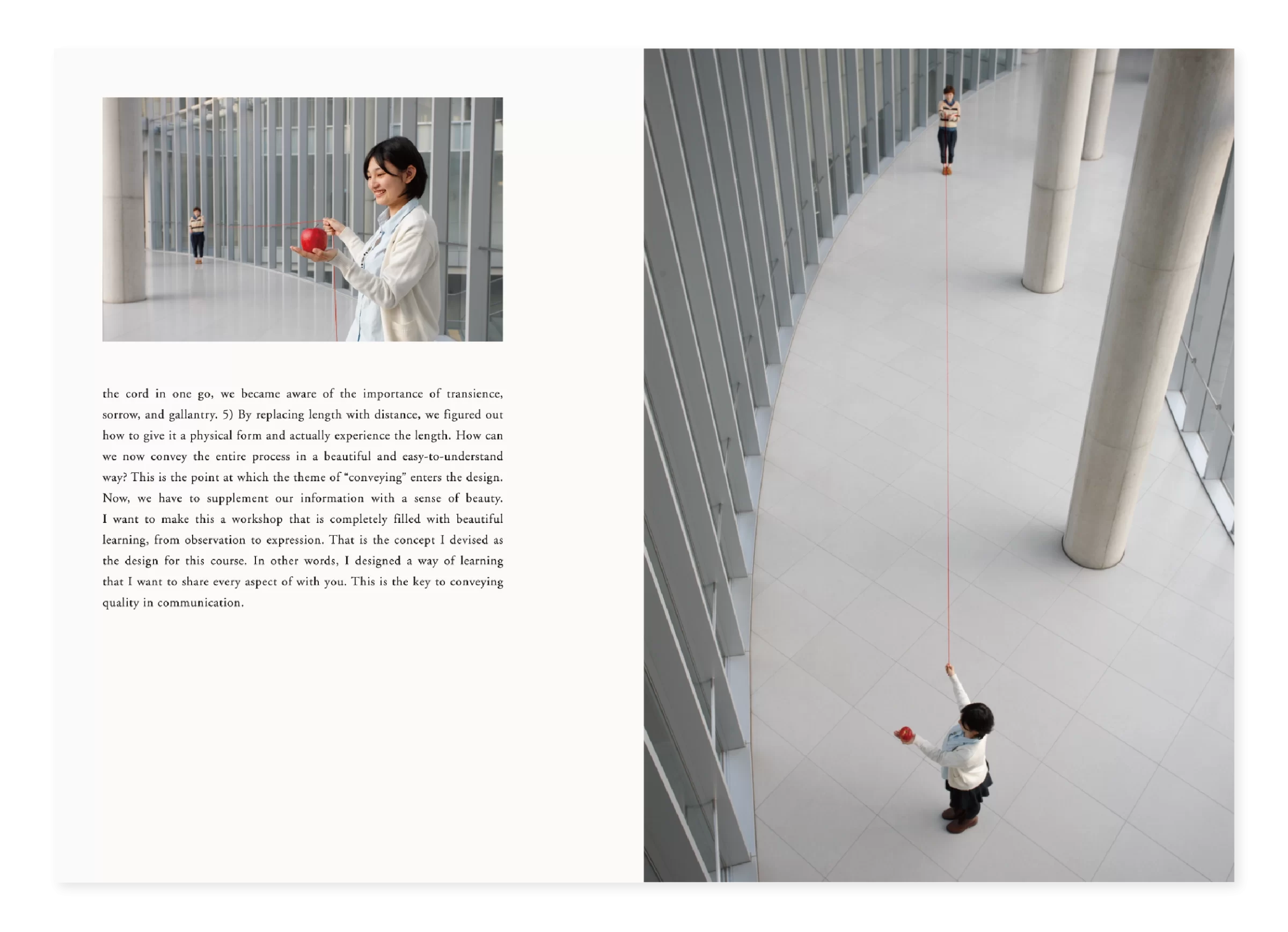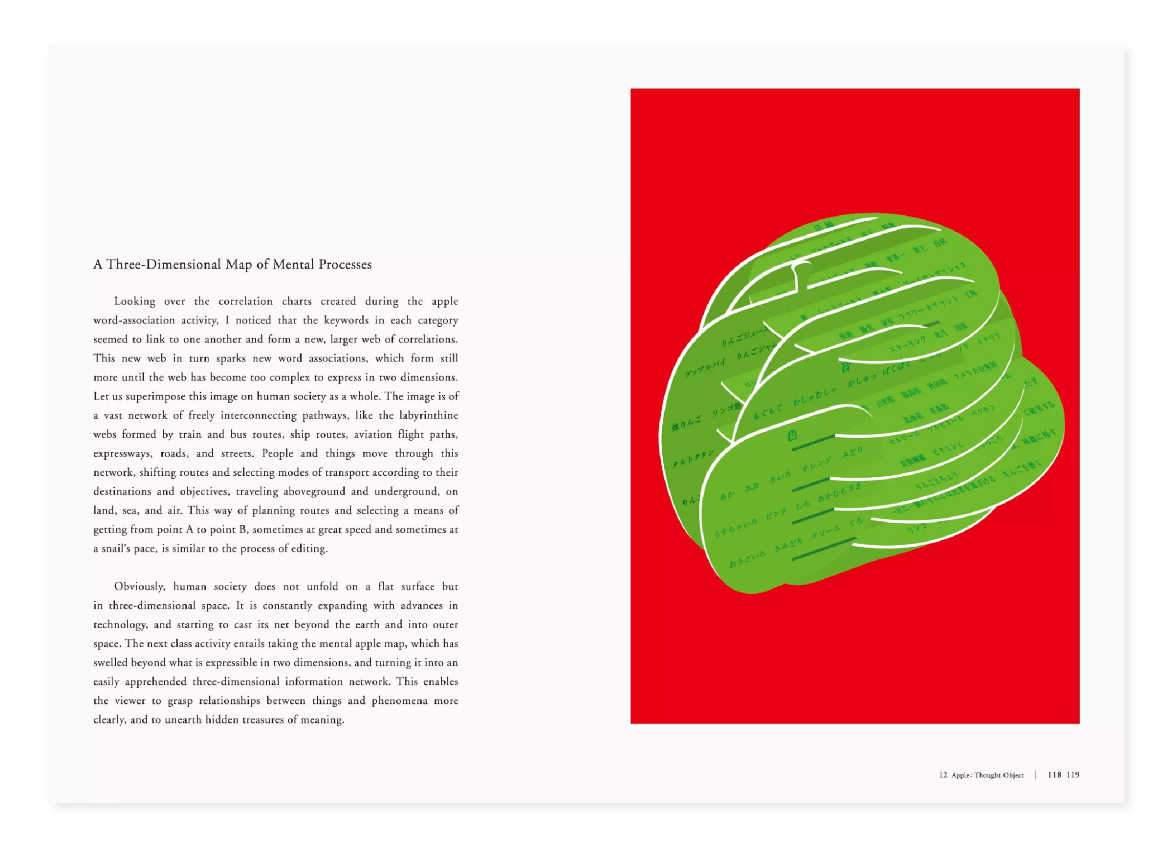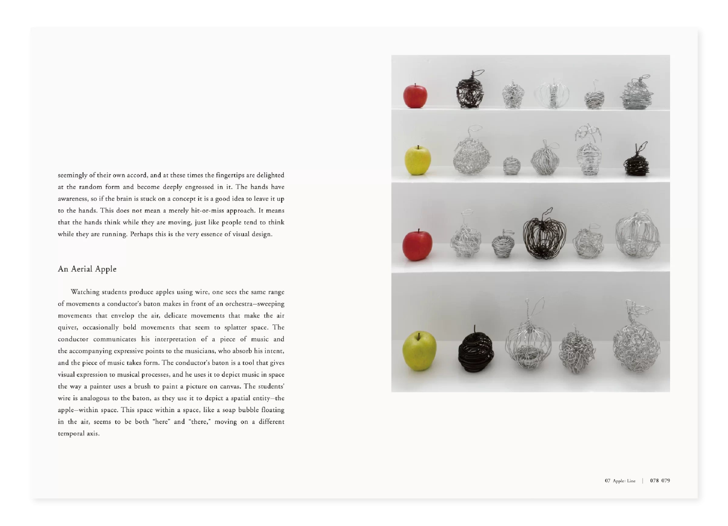 「APPLE」は一つの授業として始まりました。りんご一つを手に取り、15週かけてデザインの基礎を考える。それは答えを教えるためではなく、問い直すための試みでした。「考え方の考え方」「作り方の作り方」「伝え方の伝え方」「学び方の学び方」といった、デザインのさらに手前にある思考の層に光を当てる教育です。デザインを教える教科書は、なぜ「思考」を扱わず、「結果」だけを並べるのか。ないなら、自分で作ろう。この単純な決意が、授業を越え、講演となり、出版となり、展覧会へと広がっていきました。授業で生まれた問いは、やがて国内外のデザイナーや教育者に届き、英語版、日本語版、中国語版、韓国語版と4ヶ国語で出版されました。問いは時間や場所に縛られず、世界を巡り、読む者に新たな考えをもたらします。本は完成形ではなく、途中の思考が紙に刻まれています。そこには、答えではなく、問いを受け取り考え続ける余白が残されています。学びとは、固定された知識ではなく、思考の連鎖を紡ぐ営みです。その営みは、時を越え、国境を越え、次の世代の心にそっと宿ります。10年後、かつてのアンチテーゼは、高校美術の教科書に迎え入れられました。『APPLE』はもはや単なる授業でも教科書でもなく、問いは次の世代の心に芽を出し、やがて枝を広げ、風に揺れ、光を受け、深い森へと育つことを静かに願っています。