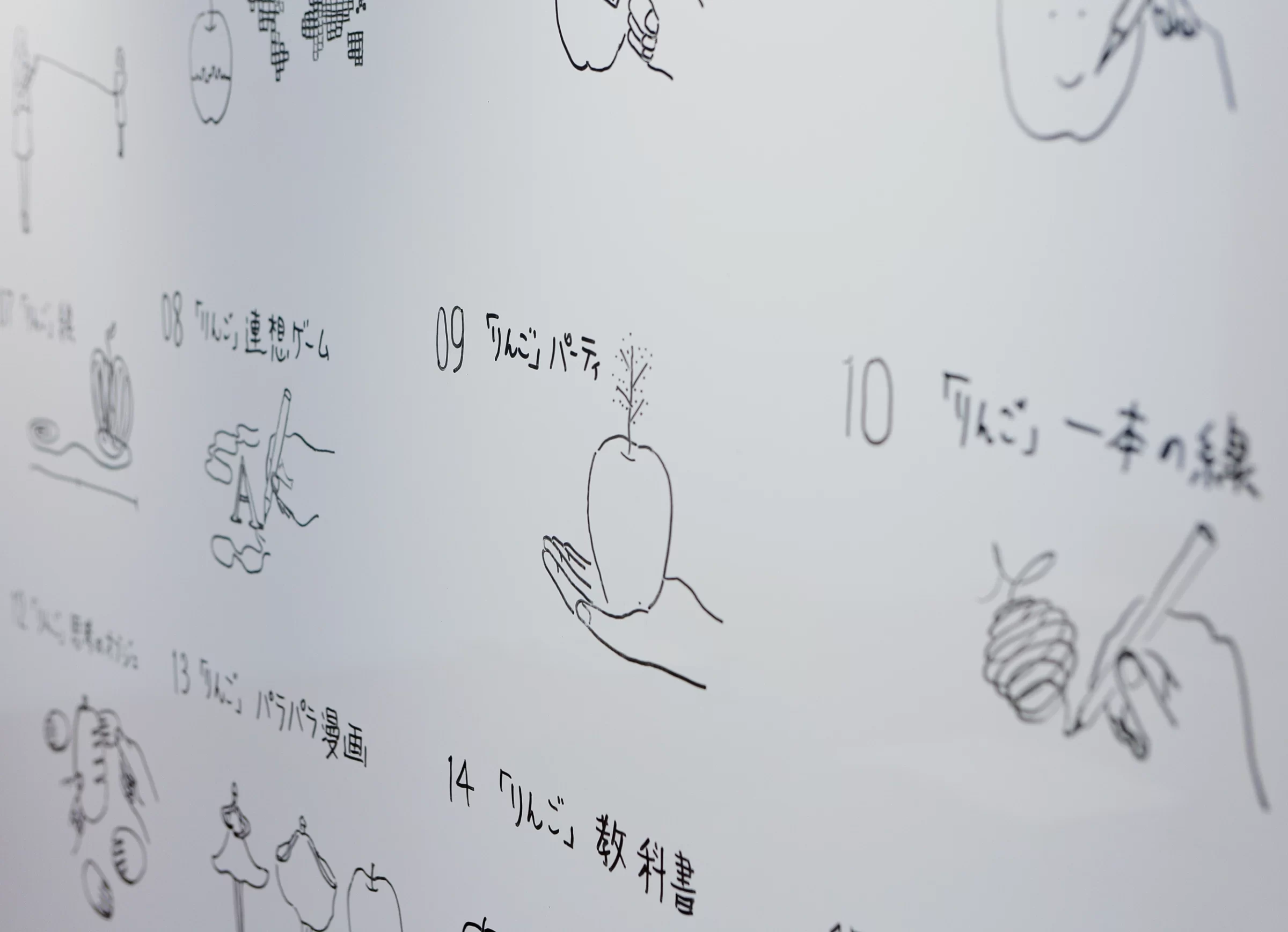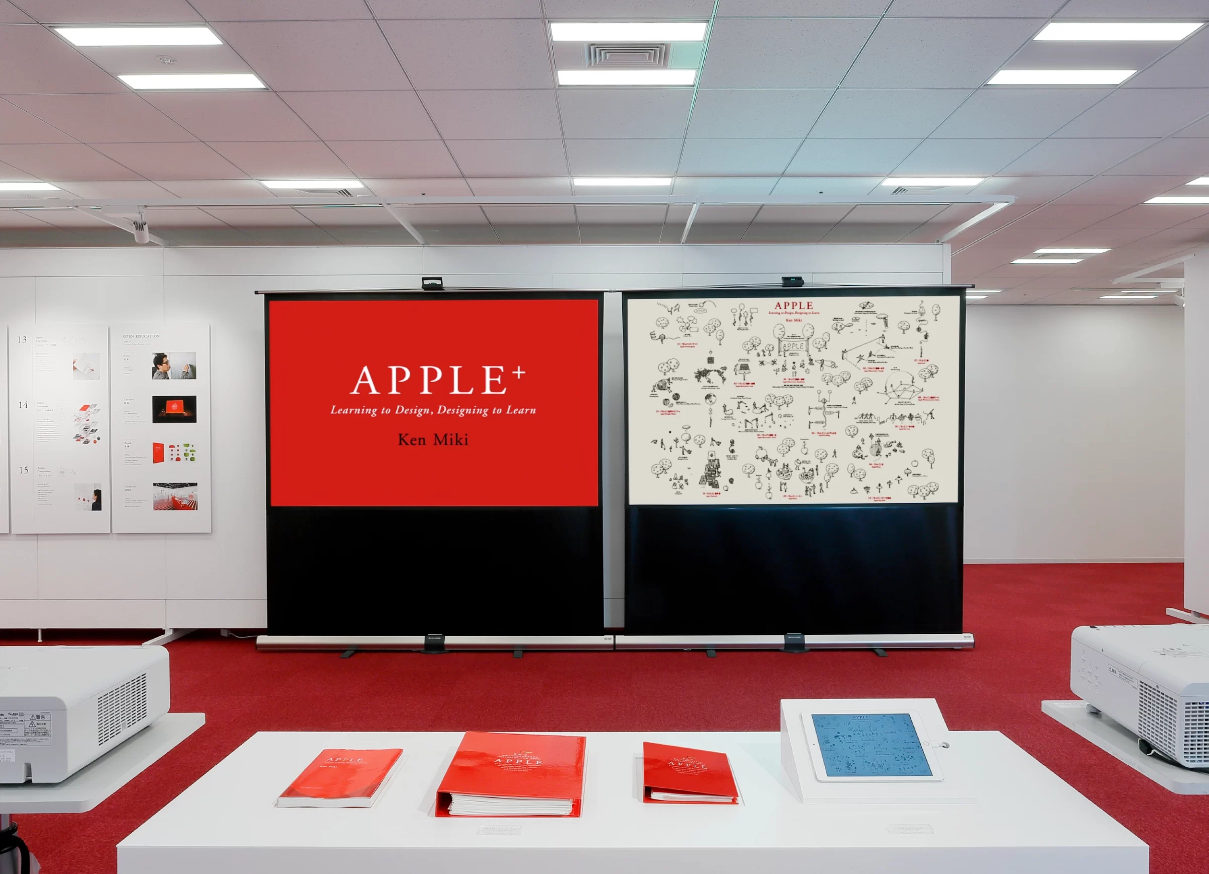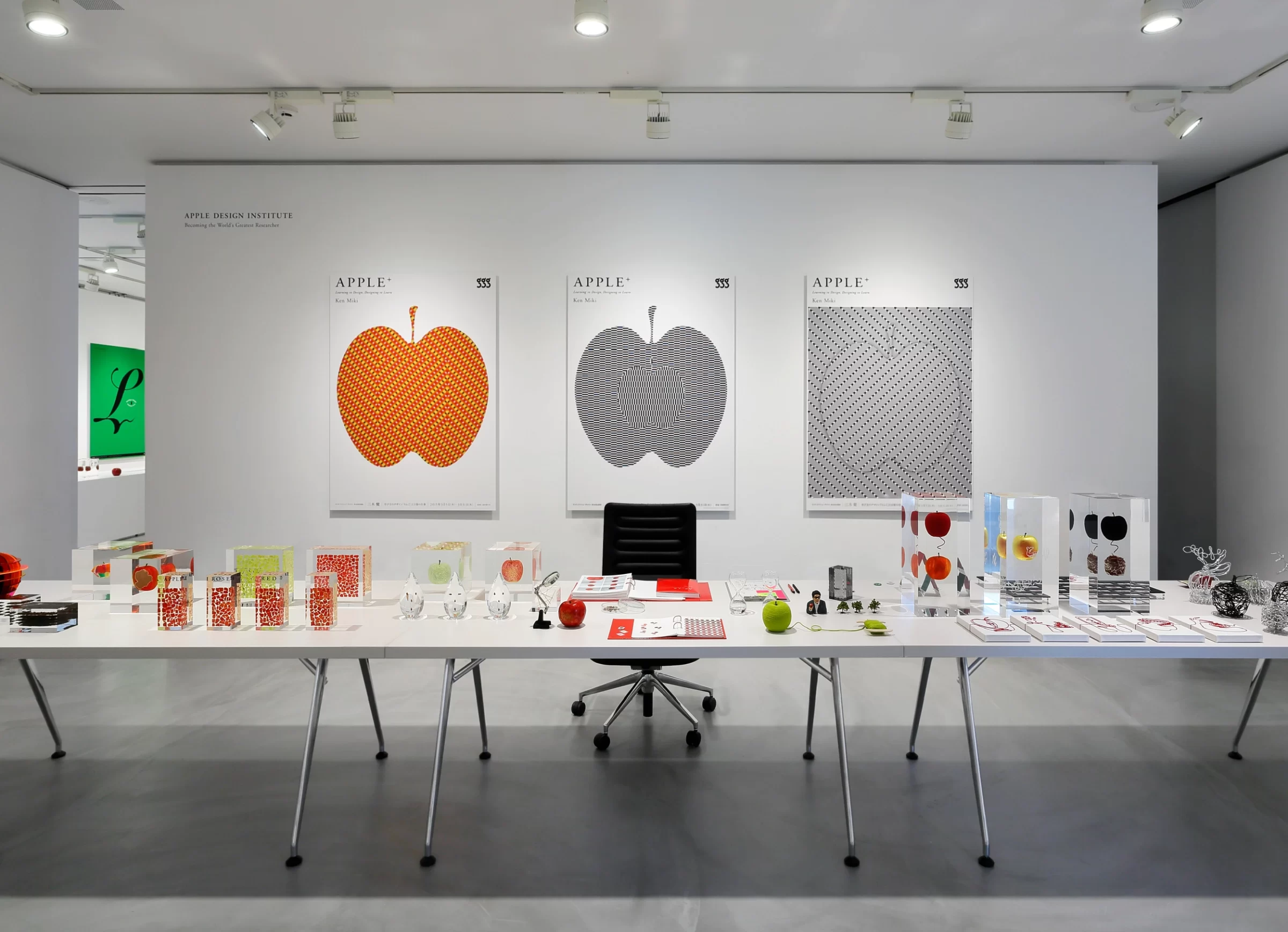「Graphic Design in Japan」に出品された作品の中から、最も優れた作品とその制作者に贈られる亀倉雄策賞。1964年東京オリンピックのエンブレムや公式ポスター、グッドデザイン賞Gマーク、NTT、TDK、NIKONなど、世界を代表するデザイナー、亀倉雄策氏の名を冠するこの賞の受賞を記念して、展覧会が開催されました。展覧会は東京のクリエイションギャラリーG8を皮切りに、大阪芸術大学、新潟県立近代美術館へと巡回し、その後、世界へも広がる予定です。受賞対象となった「APPLE+」展の経験をもとに、今回は「りんごデザイン研究所」と名付け、大阪芸術大学の研究室空間を拡張した展示環境を設けました。ここでは、思考のプロセスやメイキングの痕跡を含め、「りんごの種を植える前」の状態を体感することができます。当初の企画は全く異なるものでした。2020年開催予定だった東京オリンピックのエンブレムコンペ案と亀倉雄策賞受賞作品のAPPLEを並べることで、展覧会の意義を際立たせようと考えていたのです。しかし、オリンピックの決定延期や再コンペの実施、SNSでの誹謗中傷の激化など、社会情勢は大きく揺れ動きました。主催者から「この状況で発表すると、三木さんを守りきれないかもしれない」と懇願され、熟慮の末、当初の企画は取りやめる決断に至りました。この決断は単なる変更ではありません。デザインは、作品そのものだけで完結するものではなく、社会の文脈や受け手との関係の中で生まれるものです。今回の展覧会は、作品の成果だけでなく、思考の過程や判断の重み、そしてデザインが世界に現れる際の責任や倫理までをも含めた「思考の空間」として提示されます。ここに、デザインの本質を問い、考察し、判断する体験の機会が存在しているのです。