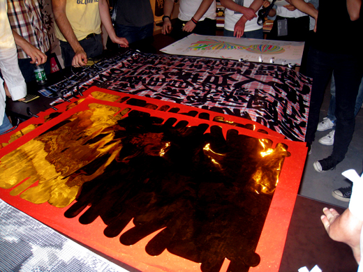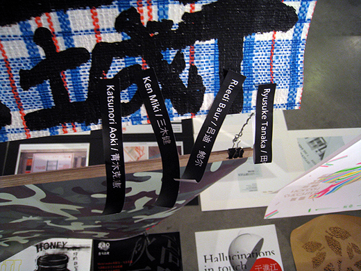 翌朝。青木克憲さんの講演を聞き、午後からの審査です。審査会場にところ狭しと作品が埋められています。文化の違う作品群を見るだけで昨日の疲れも吹っ飛び、テンションが上がってきます。主催者から審査方法の簡単な説明と同時に審査員の名前の刷られたシールが配られ一次審査の開始です。ポスター、書籍、V.I、タイプフェイス、シンボルマークなどのカテゴリーがざっくりと分けられていますが、どうやらまとめて審査を進めていくようです。日本では、カテゴリーごとの審査が通常で事務局がテキパキとシステマチックに準備をしますが、何かゆるい感じの雰囲気です。作品の下に作品が埋もれていたりもします。気に入った作品に審査員の名前シールを貼付けていくのですが、粘着力が強すぎて作品から剥がれません。無理矢理剥がすと破れる始末。入選作の撮影どうするんだろうと心配しながら1日目が終了です。