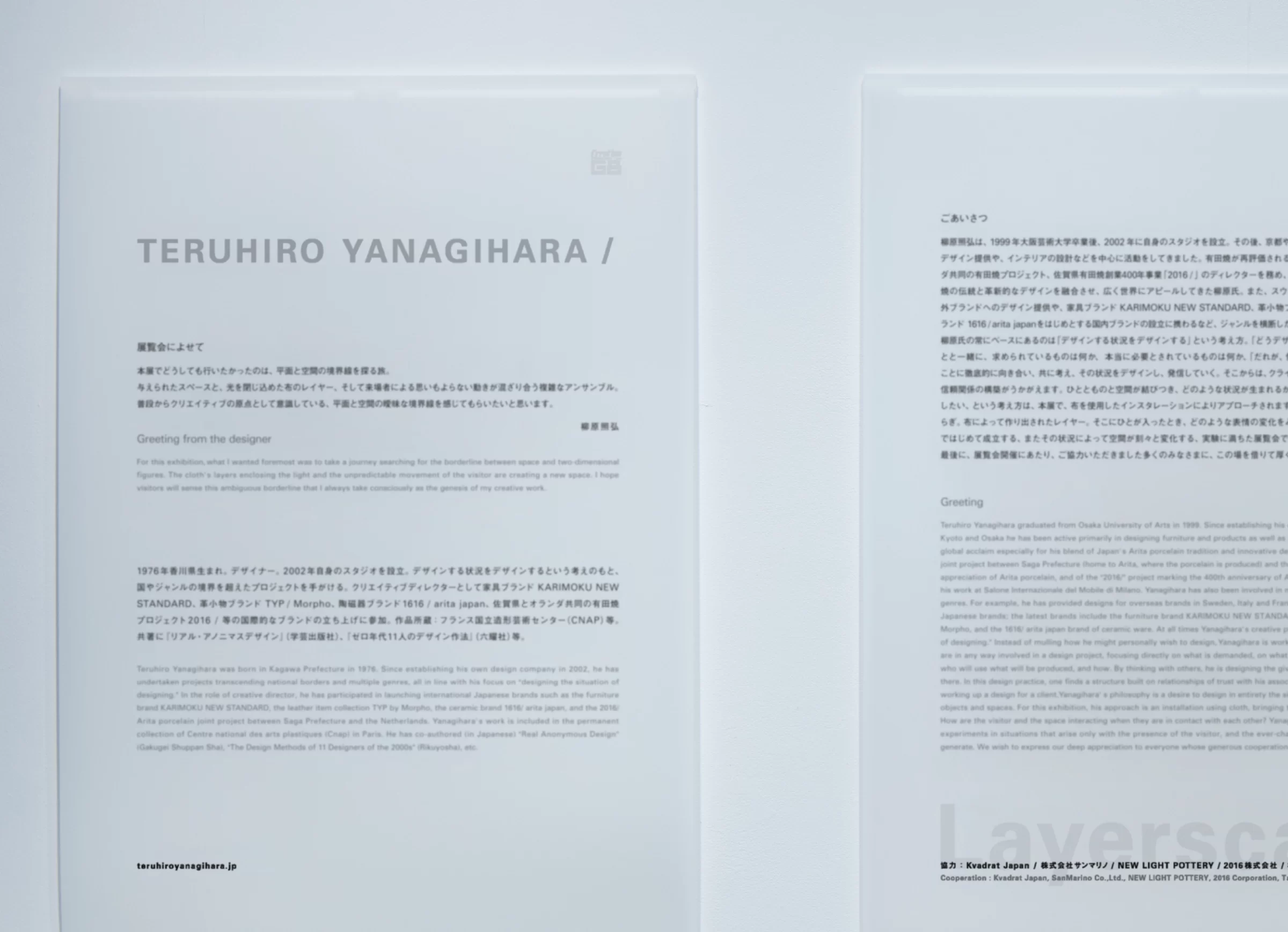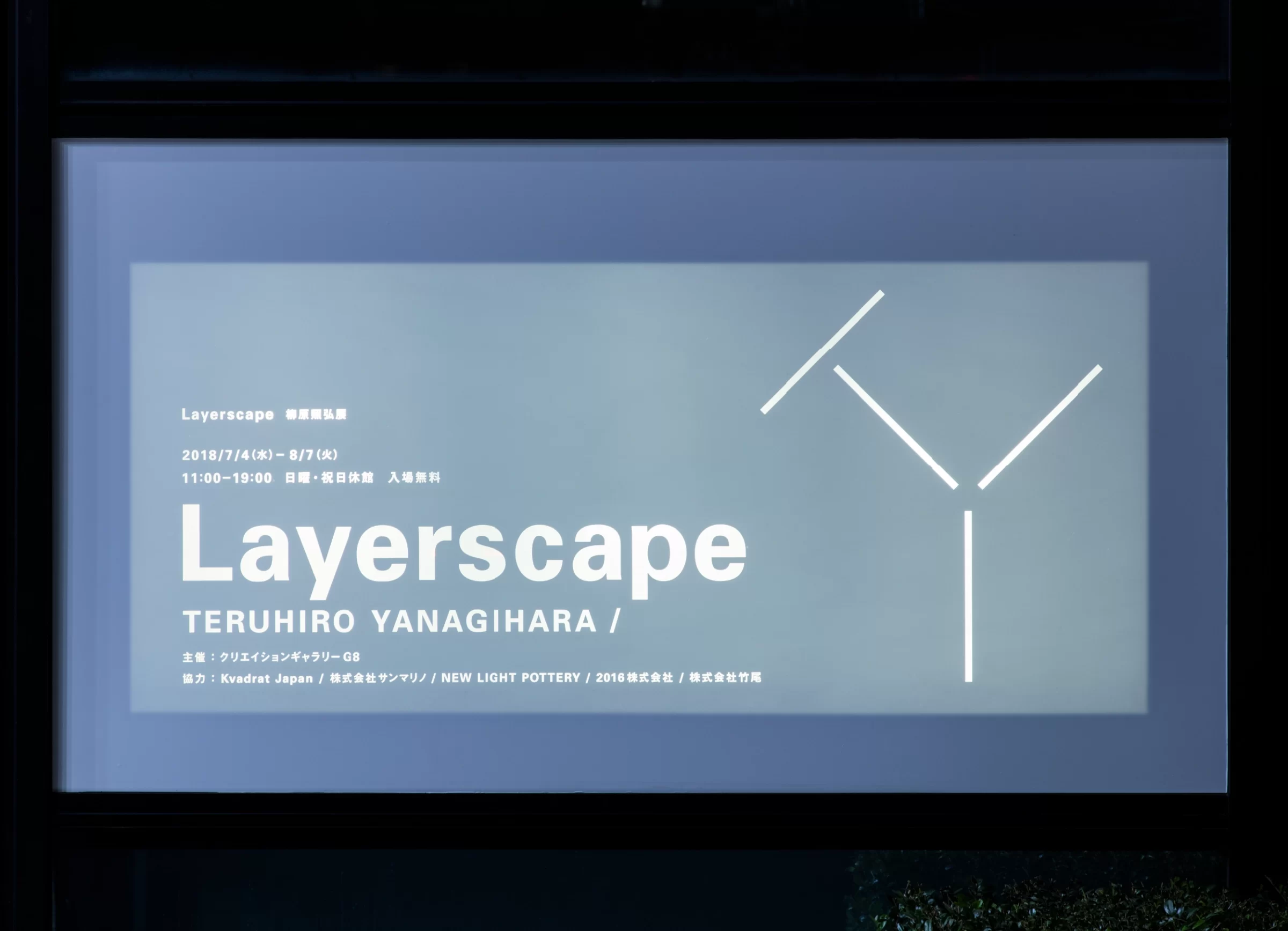 世界から注目を集めるプロダクト・空間デザイナー、柳原照弘さんからの依頼で、クリエーションギャラリーG8で開催される個展「Layerscape展」のサイン計画とインスタレーション計画に協力しました。展覧会のシンボルは、4本の線で構成され、Teruhiro Yanagiharaの「T」と「Y」を象ったものです。透けるトレーシングペーパーに表と裏から印刷されたポスターは、わずか数ミクロンの紙の厚さを活かして奥と手前にシンボルを配置しており、その微細な重なりが、光や視線の角度によって揺らぎ、紙の向こうに広がる空間の奥行きと時間の流れを体感させます。わずかな厚みの差が、単なる平面のポスターを、まるで時空間が層を成して浮かび上がるかのような立体的な体験に変えるのです。インスタレーションでは、柳原さんから「素材の向こうにぼんやり映る人物で、この空間の気配を表現できないか」という提案があり、私はそこに4本の線のパーツを加えることで、さらに『間』を感じる空間表現を探りました。線の微妙なズレや透け感が、観る者の視線を奥へ奥へと誘い、空間の静かな呼吸や存在感を意識させる体験を生み出しています。このプロジェクトを通して、素材の厚み、線の配置、光の揺らぎが織りなす微細な重なりの中にこそ、「間」の本質的な価値が宿ることを改めて感じました。数ミクロンの紙の厚ささえも、観る者に空間の奥行きや時間の余韻を意識させる力を持つ、そんな繊細で豊かな体験を目指したデザインです。