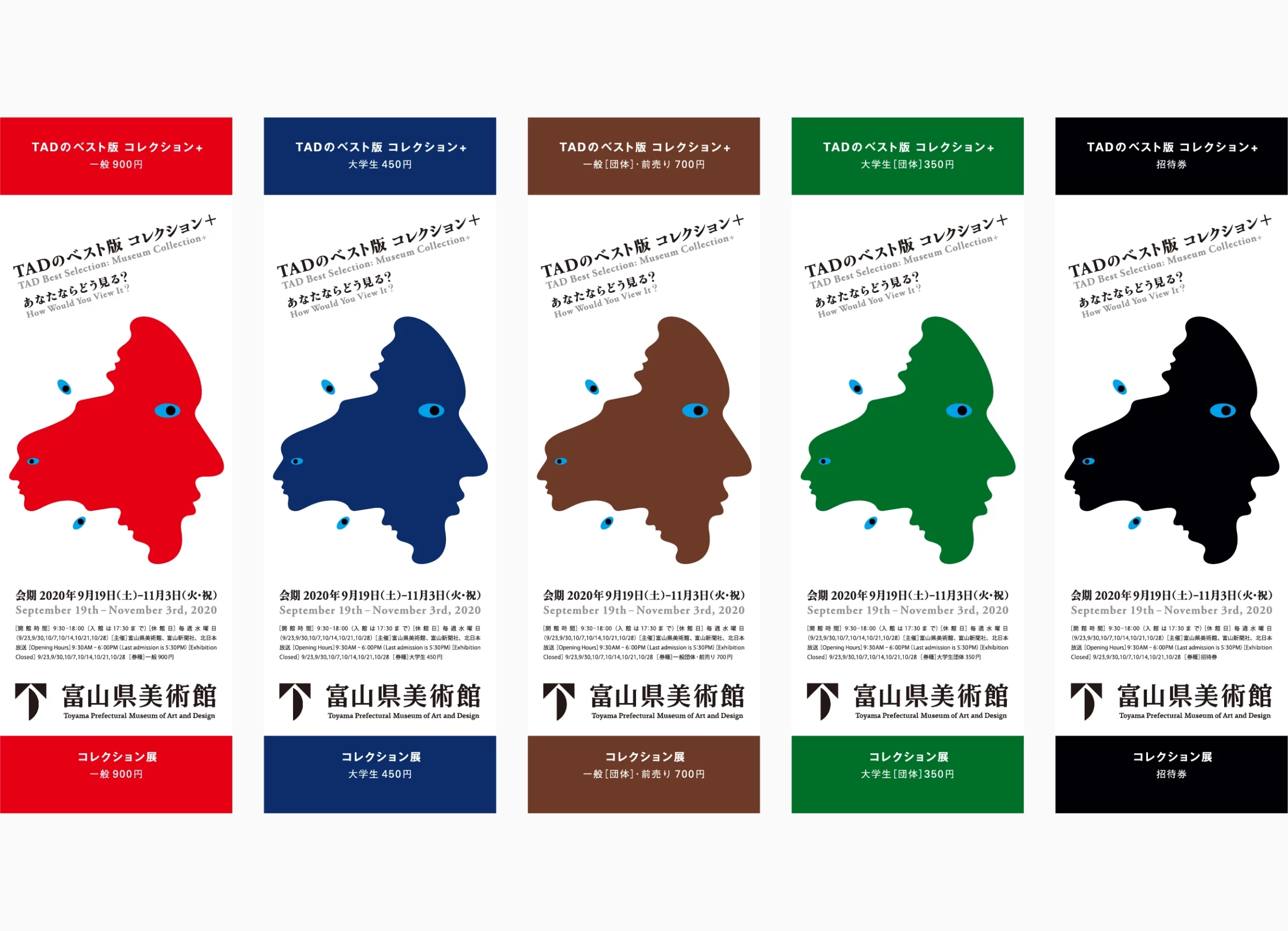 Works Exhibition 富山県美術館 Works一覧へClient別一覧へ あなたならどう見る? 富山県美術館「TADのベスト版 コレクション+」 Concept ピカソやミロをはじめ、時代と国境を超えた作品群を、過去最大規模で一堂に会する展覧会「TADのベスト版 コレクション+」。しかしこの展覧会の本質は、単なる名作の羅列に留まりません。異なる領域で創造を紡ぐ4人のクリエイター(開発好明氏、とに~氏、林道郎氏、山内マリコ氏)の視点によって、作品は新たな光を浴び、私たちの目に「再び」映し出されます。展覧会では、4者の視線をひとつの横顔として「地と図」の造形表現で可視化。私たちは、同じ作品を見ながらも、まったく異なる感覚や物語に触れることになります。「同じものを見ているのに、違うものを見ていた」という体験、それこそが美術の魅力の本質であり、鑑賞者に潜む想像力や感受性を揺さぶる瞬間です。作品そのものが放つ力と、個々の視点による解釈の交差点で、私たちは美術の多層的な世界を知覚します。本展は、ただ鑑賞するだけではなく「見ること」と「感じること」の関係を哲学的に問い直す場でもあります。美術とは、固定されたものではなく、私たちの心のなかで生き続ける経験なのだ。その豊かさを、ぜひ体感してください。 Credits 2020年09月19日(土)~11月03日(月・祝) Art direction: Ken Miki Graphic Design: Ken Miki, Yoko Inuyama