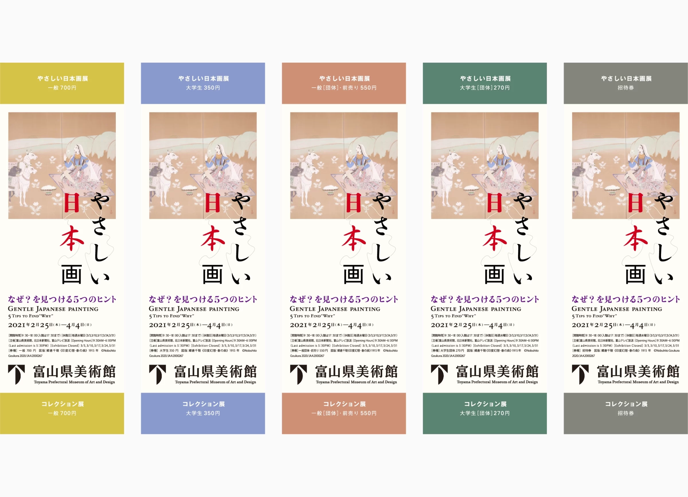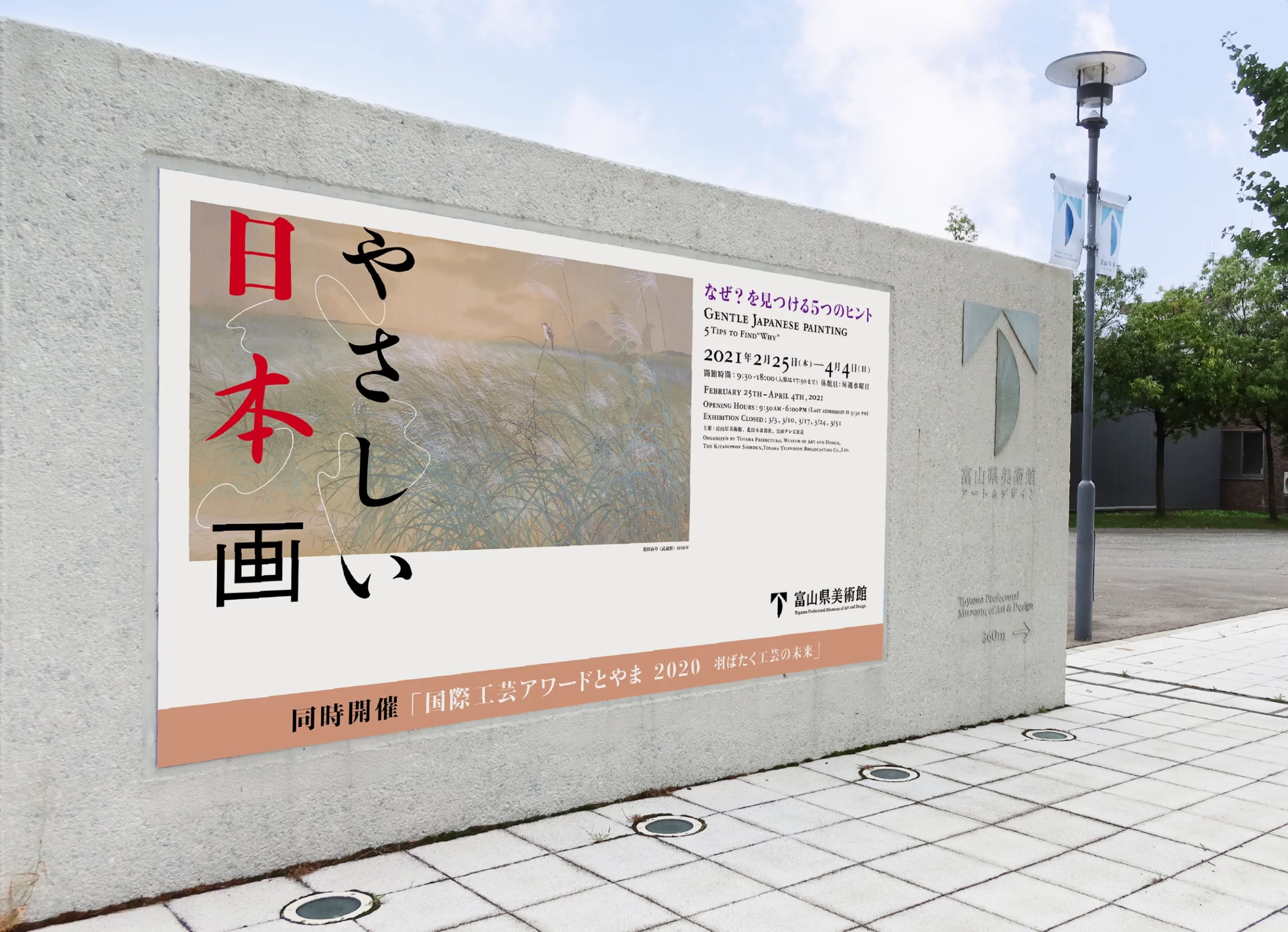 富山県美術館の企画担当の学芸員はこう語ります。「数ある美術作品の中でも、とりわけ日本画の美しさには、どこかやさしさが感じられます。しかし、作品と向き合う中で『なぜそのように感じられるのか』を意識する機会は案外少ないのかもしれません。」本展では、この問いを手がかりに、日本画の魅力をじっくり味わうための仕掛けとして、「なぜ?を見つける5つのヒント」を設けました。5つの視点「いつ、どこで、誰が、何を、どのように」を通じて、季節の草花や心温まる風景、穏やかな色使い、荘厳な精神性、哀愁を帯びた表情など、画面の隅々に潜むやさしさの理由を探ります。僕は、この5つの視点をたどる柔らかな感性を、浮遊するやさしい5本の線で表現しました。それぞれの線は、問いかけと感覚の軌跡を象徴し、画面の余白の中でそっと浮かび、静かに揺れます。さらに、5本の線は独立しつつも互いに呼応し、個々の視点が織りなすハーモニーを生み出します。これは、日本画が持つ多層的な美しさや、作品の一筆一筆に込められたやさしさの重なりを、視覚的に体現する試みです。学芸員の問いかけとデザインを通じて、観る人は日本画のやさしさを再発見し、改めて作品と向き合う時間を楽しむことができるのです。