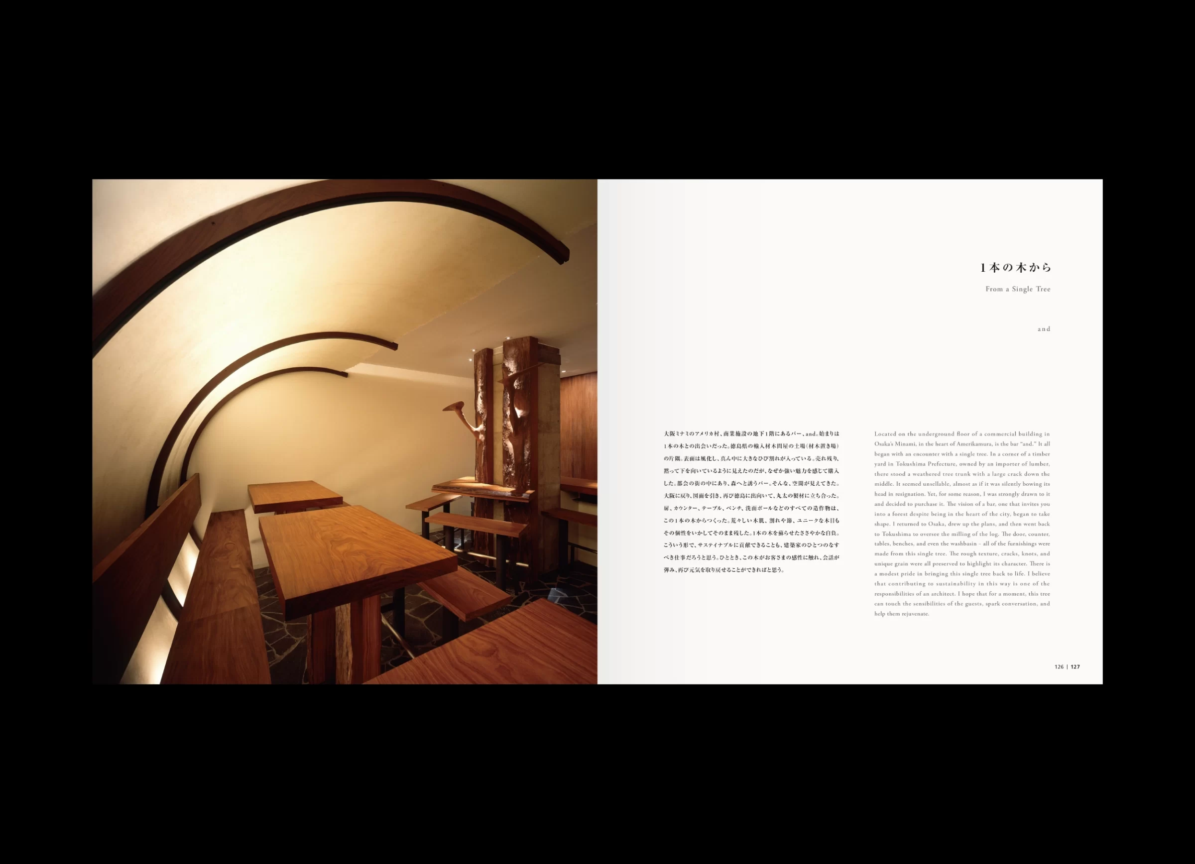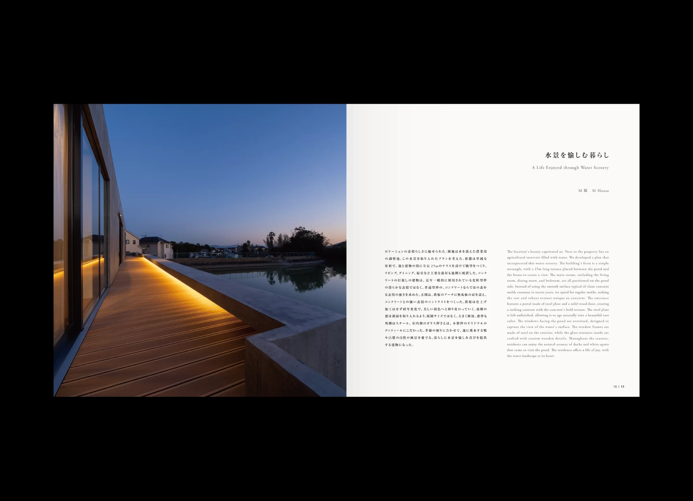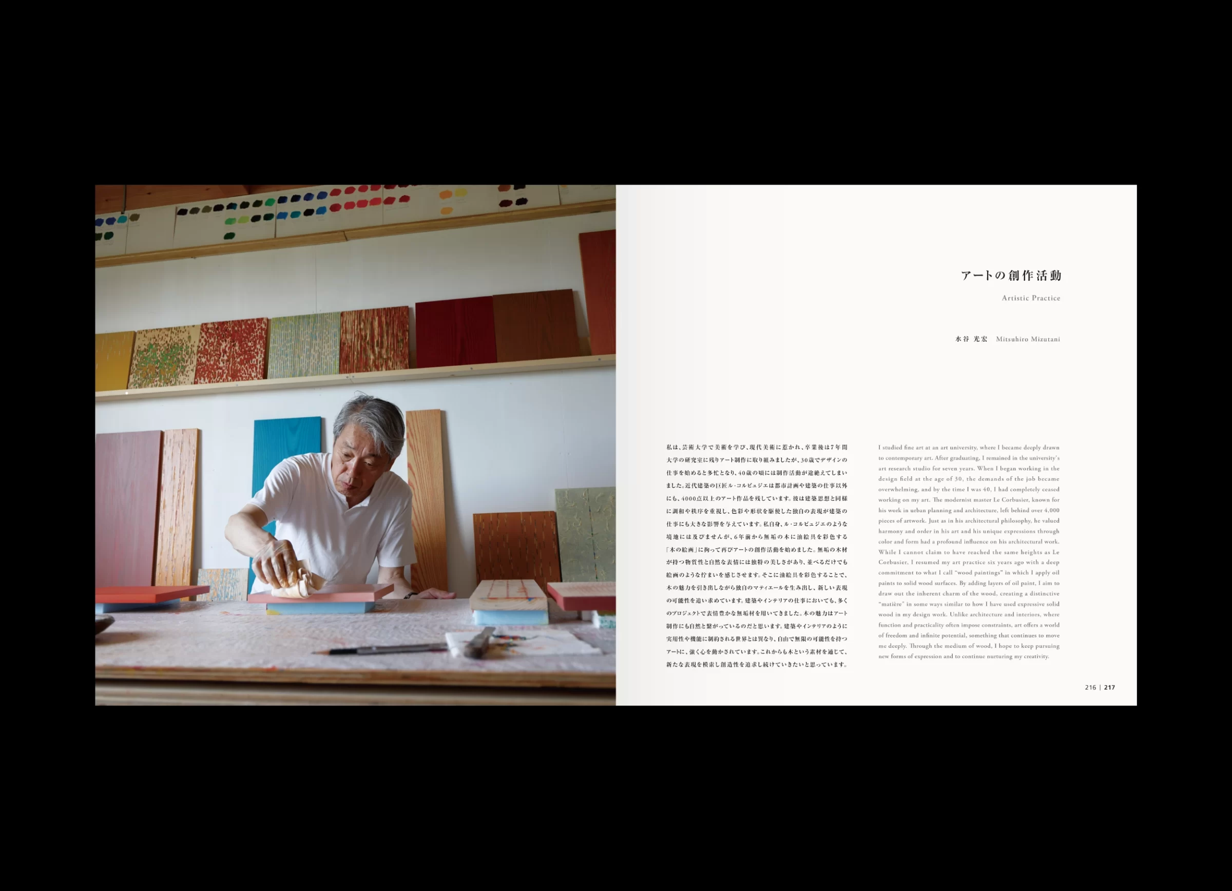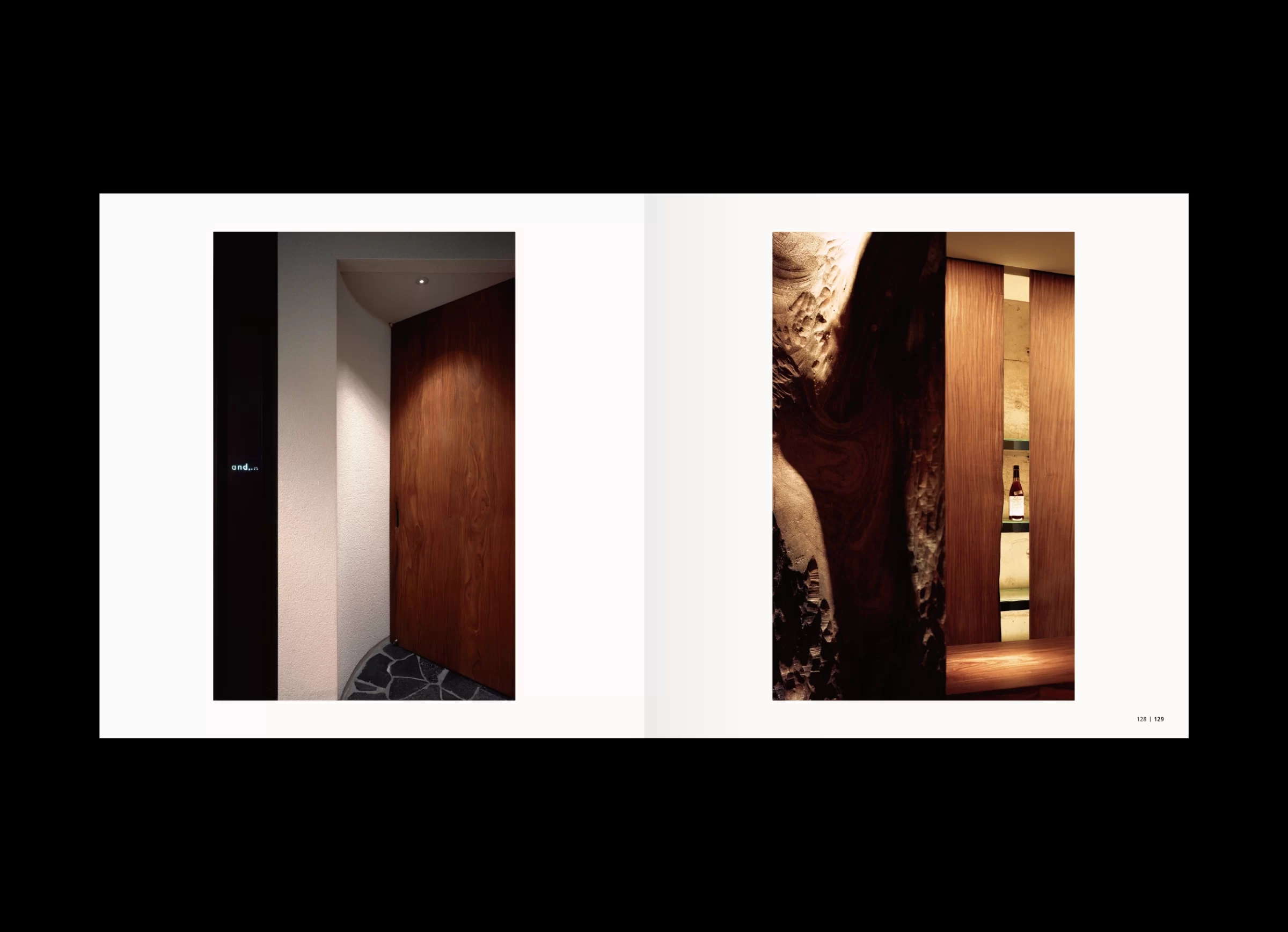 「水谷光宏作品集」は、近年の作品から初期作まで、およそ40年にわたる創作活動の中から選び抜かれた内容で構成されています。大阪芸術大学を卒業後、現代美術作家・泉茂氏に師事した水谷さんは、環境アートの仕事に携わりながら、独学で現在の空間デザイナーとしての立ち位置を築いてこられました。その出発点はあくまでアートにあり、やがてインテリア、建築へと領域を横断しながら、空間デザインという実践へと展開していきます。本書の巻頭で水谷さんは、「体験的価値である空気感を、自らの肌で感じ取ること」を大切にしていると語っています。その言葉どおり、素材への強いこだわりや、職人との密な協業は、水谷さんの活動を特徴づける重要な要素です。各プロジェクトにおいて自ら素材を探し、選び、時には収集のために各地を飛び回りながら、工房や職人と頻繁に対話を重ねていきます。そこでは計画通りに進むだけでなく、偶然の出会いに導かれるように、触発された素材からイメージを組み立て直すことも少なくありません。実際、私が依頼したプロジェクトでは、偶然見つけた雨ざらしの鉄板に惹かれ、あえて新品の鉄板と交換し、空間に構成されたことがありました。 水谷さんの空間づくりは、素材を見極める目や職人技といった身体感覚に対して、極めて繊細に神経を巡らせながら、機能的価値と情緒的価値が重なり合う地点を探り続ける営みだと言えるでしょう。本書では「建築・インテリア・アート」という三つのコンテンツで構成されていますが、それらは明確に分断された領域ではなく、互いに滲み合いながら立ち上がっています。その重なりの中にこそ、水谷光宏という表現者が生み出す〈水谷空間〉の本質が浮かび上がってくるのです。