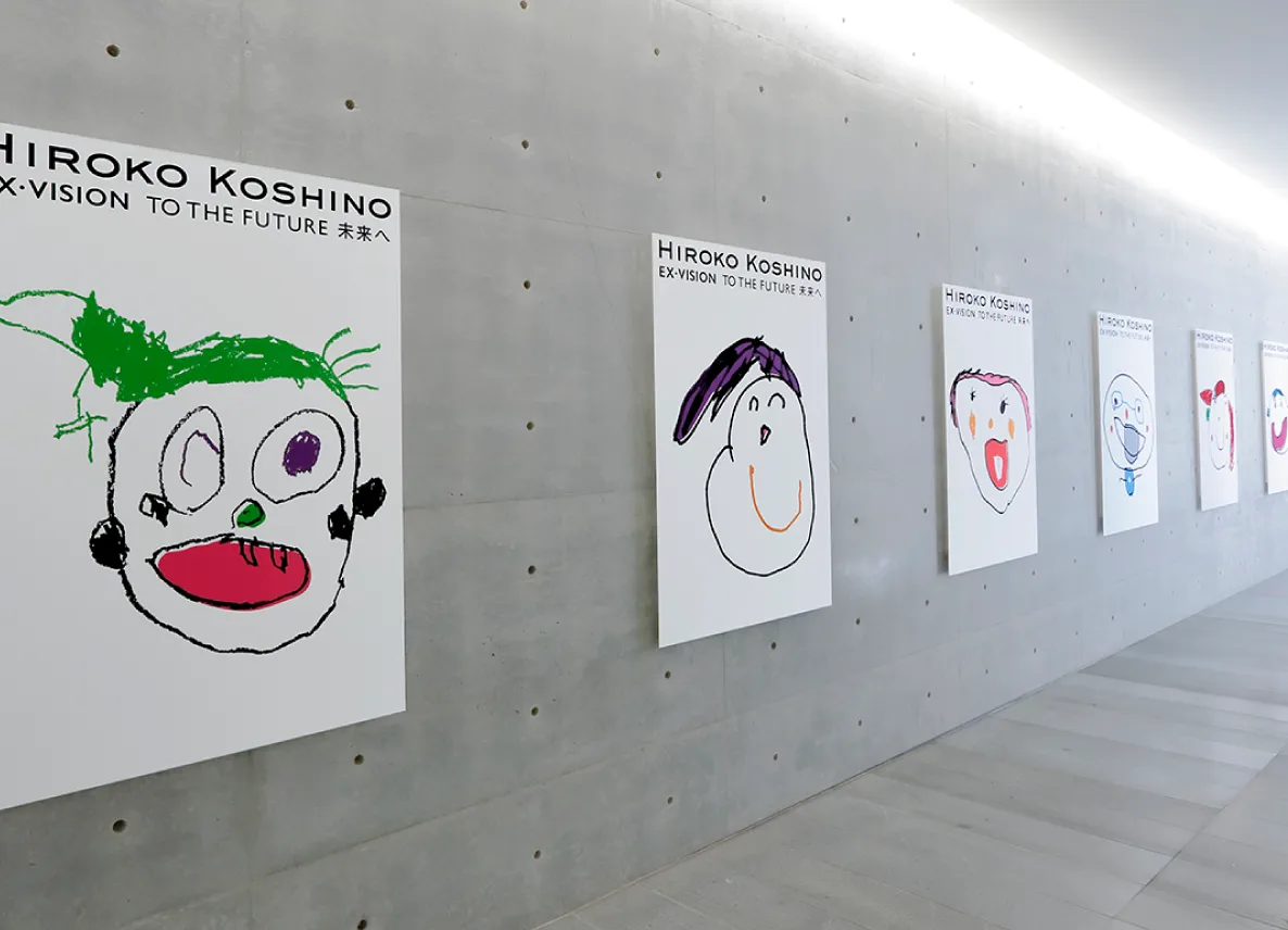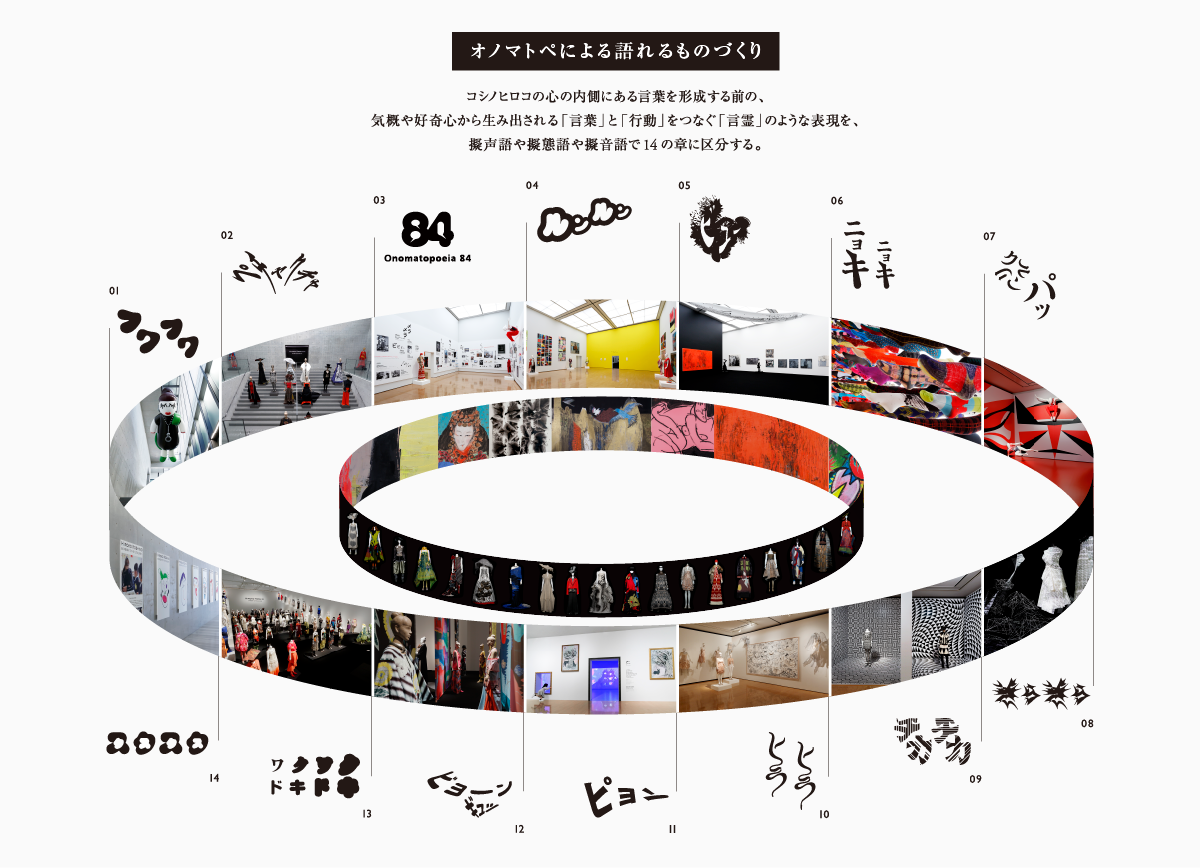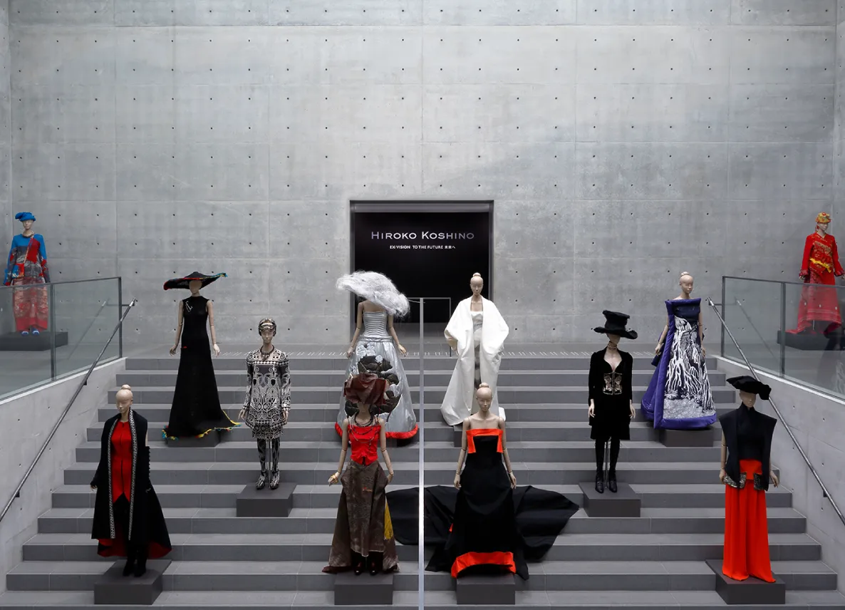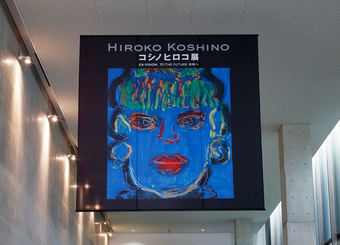 本展は、新型コロナウイルス感染症という未曾有の状況下で、兵庫県立美術館にて開催された、ファッションデザイナー・コシノヒロコの展覧会です。企画はコロナ以前から始まり、当初は傘寿を記念した書籍『HIROKO KOSHINO』に沿って、その軌跡を辿る構成を想定していました。しかし開催を1年後に控えた頃、ヒロコさんから展覧会の方向性を見直したいという連絡が入ります。世界が不安に覆われるなかで、いま必要なのは回顧ではなく、未来へ向けた光ではないか。戦時中、母に買ってもらった一箱のパステルが想像力によって未来を切り開いた原体験が、今回の決断の根にありました。「今回の不安は、戦時中に感じた恐怖以上かもしれない」。だからこそ本展は、単なるアーカイブではなく、84歳(2021年時)のコシノヒロコが未来の子どもたちへ『ときめき』を託す「TO THE FUTURE 未来へ」へと姿を変えます。展覧会は、知識を並べる場ではなく、身体で感じる場として構想されています。テーマパークを訪れた時のような高揚感。驚きや笑いが連なり、気づけば心が前を向いている。その体験こそが、本展の「VISION」です。安藤忠雄氏設計の建築空間を舞台に、会場前の大階段には5メートルを超えるヒロコちゃんバルーンを設置。その先にはヒロコさんの顔を写したマネキンが並び、一部は突然動き出します。展示全体はオノマトペによって構成され、言葉になる前の感情を呼び覚まします。ファッションとは、衣服の記録ではなく、生きる姿勢の表明である。この展覧会は、過去を保存するためのものではなく、未来へ踏み出すための想像力を取り戻す場として存在しています。