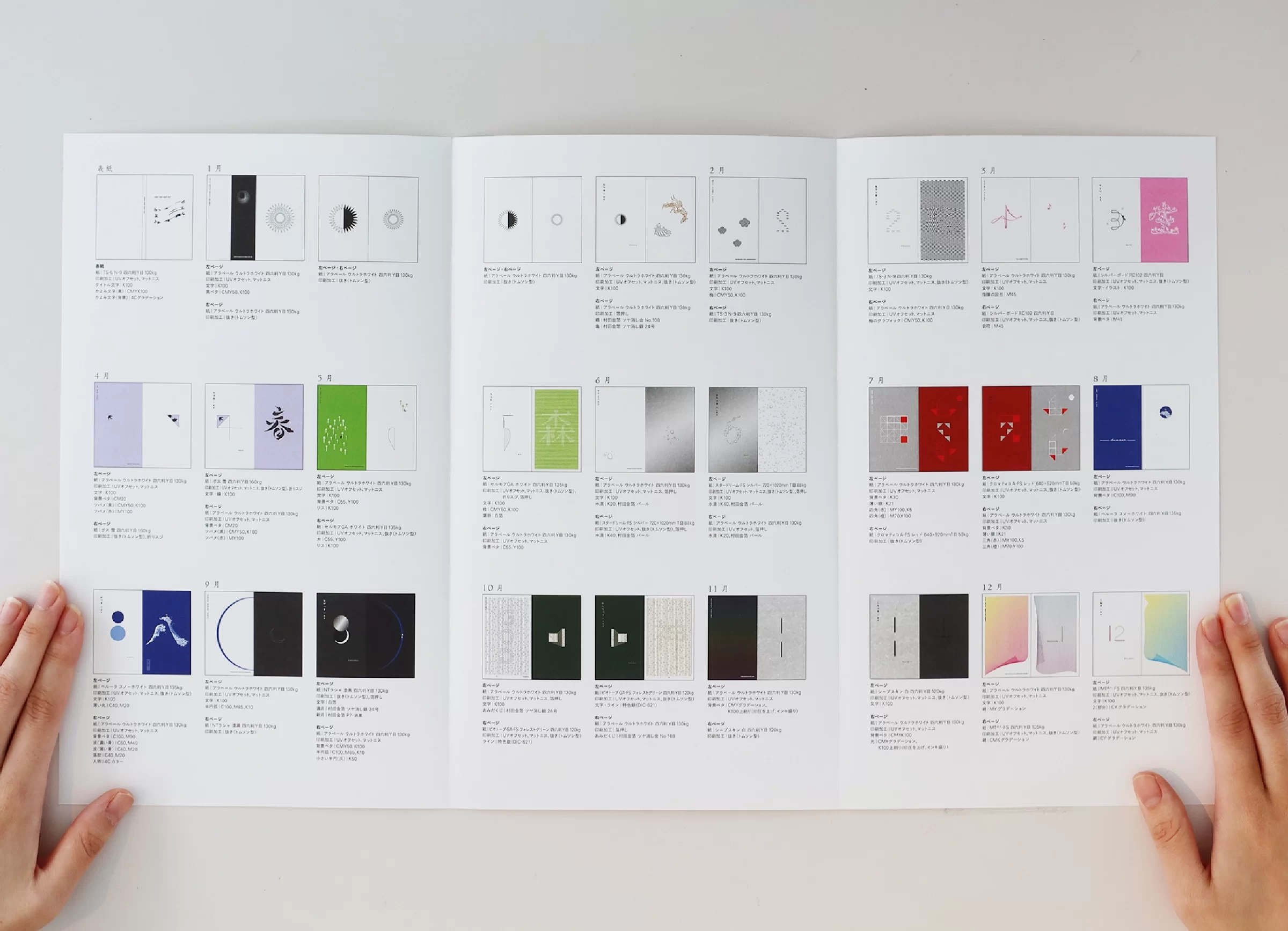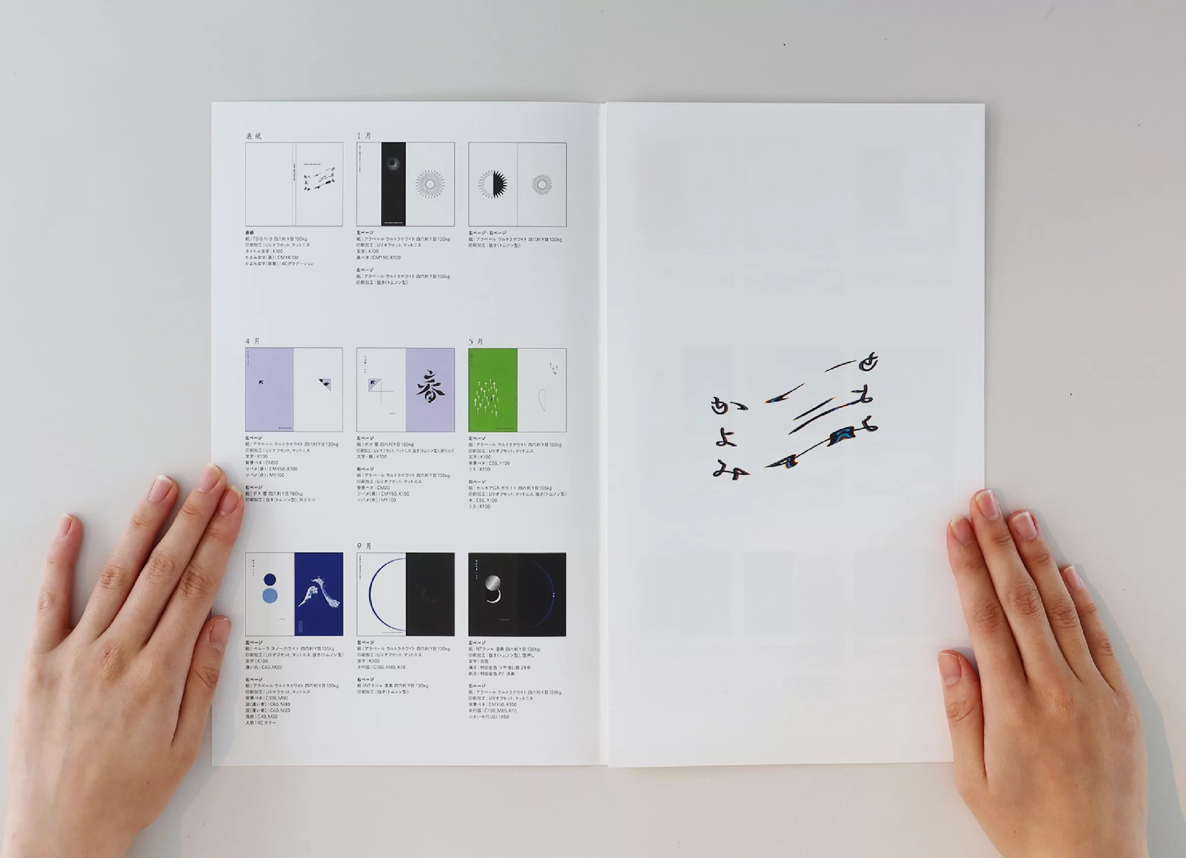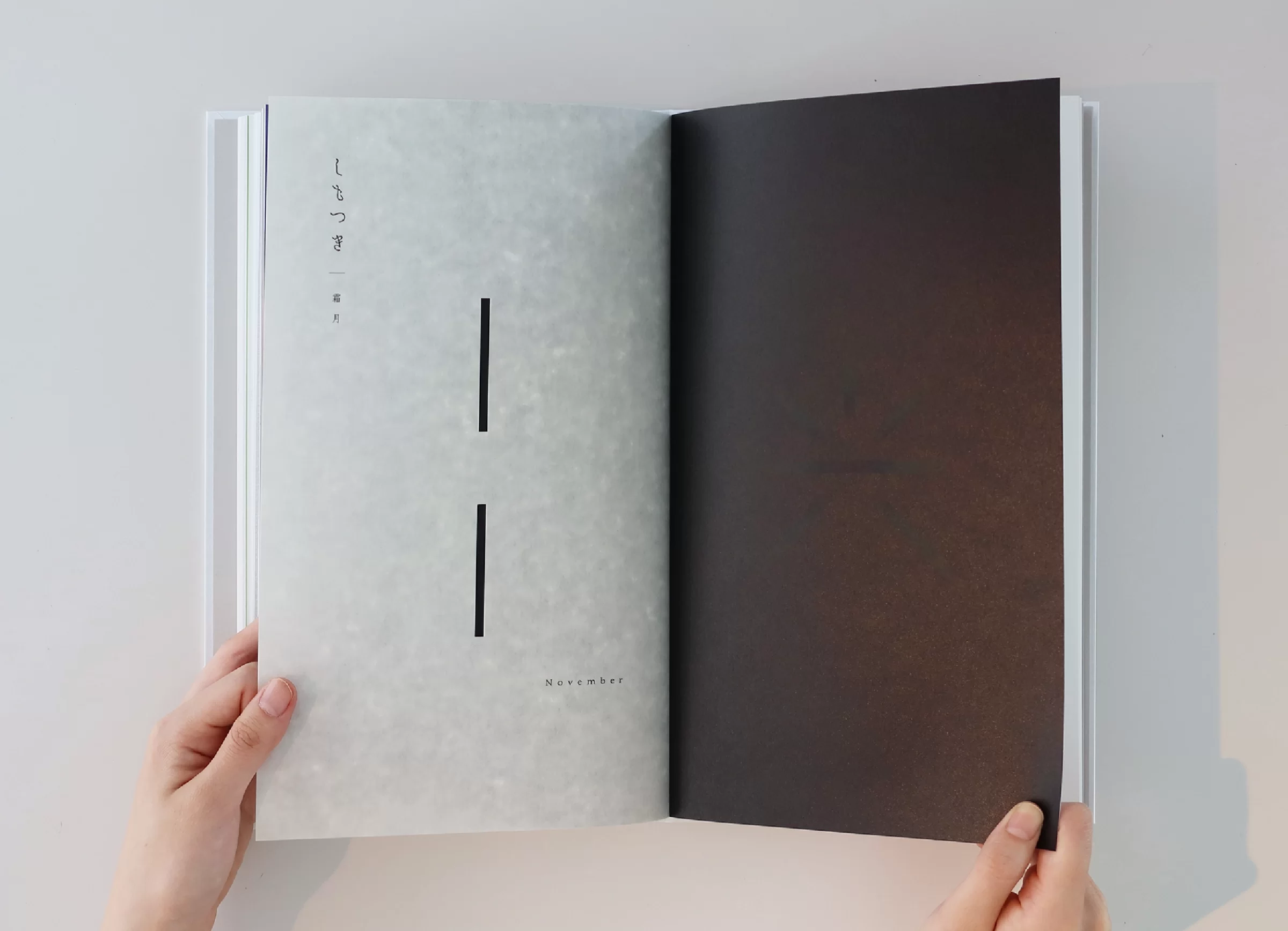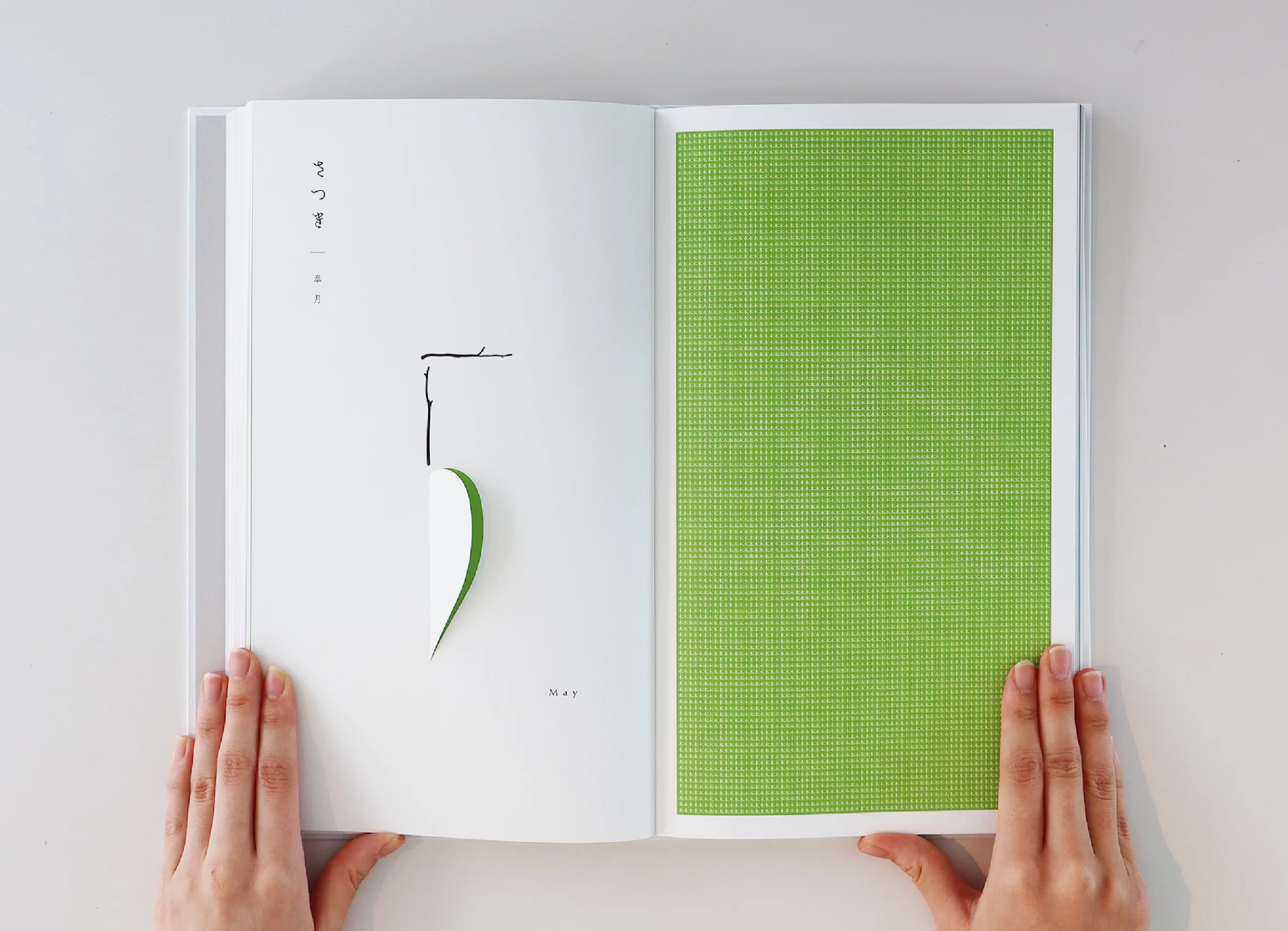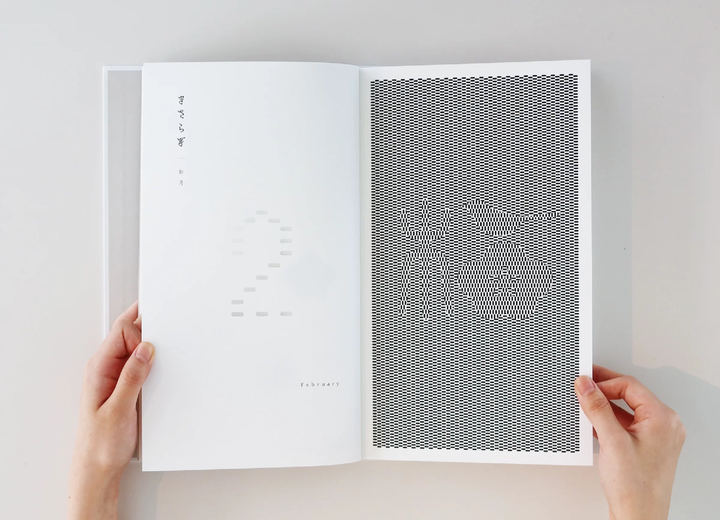 暦は「一日、二日…」と数える「日読み(かよみ)」に由来するといわれています。暦には、天体の運行や天象の予報、日付や曜日、二十四節気、七十二候、六曜、年中行事など、多くの情報が含まれています。ニュースや天気予報で「暦の上では…」という言葉を耳にすることがありますが、その表現からは、移りゆく自然のリズムに寄り添った日本の文化や風習を感じ取ることができます。暦は、いわば「暮らしのものさし」として機能してきたのです。また、暦には占星術や過去の天気情報を独自に組み立てて未来を予測する性質もあり、多面的な視座が重なることで、「暮らしの未来を想像する」浪漫が息づいてきました。2019年の竹尾デスクダイアリーは、日本の文化や風習を紡ぎながら、「毎日をていねいに暮らしていく」日本人の自然観をコンセプトに制作しました。旧暦を拠り所としたタイポグラフィで絵本のような表現を試み、月の扉の一部には、穴を開けるなど次の月へとつながる仕掛けを設け、ページをめくるたびに季節の移ろいを感じられる工夫をしています。また、扉に使用する紙はそれぞれ個性のあるものを選びました。紙の風合いや色、柄は、自然のさまざまな要素をお手本にして作られてきたのではないかと想像したからです。現在使用している紙には化学的な素材も含まれていますが、紙のルーツは植物繊維を原料としており、「植物の遺伝子」を受け継いでいます。「かみ」と「こよみ」から成る「かよみ(日読み)」──このデスクダイアリーは、ていねいに、丹精を込め、暮らしの日々を綴るための一冊です。