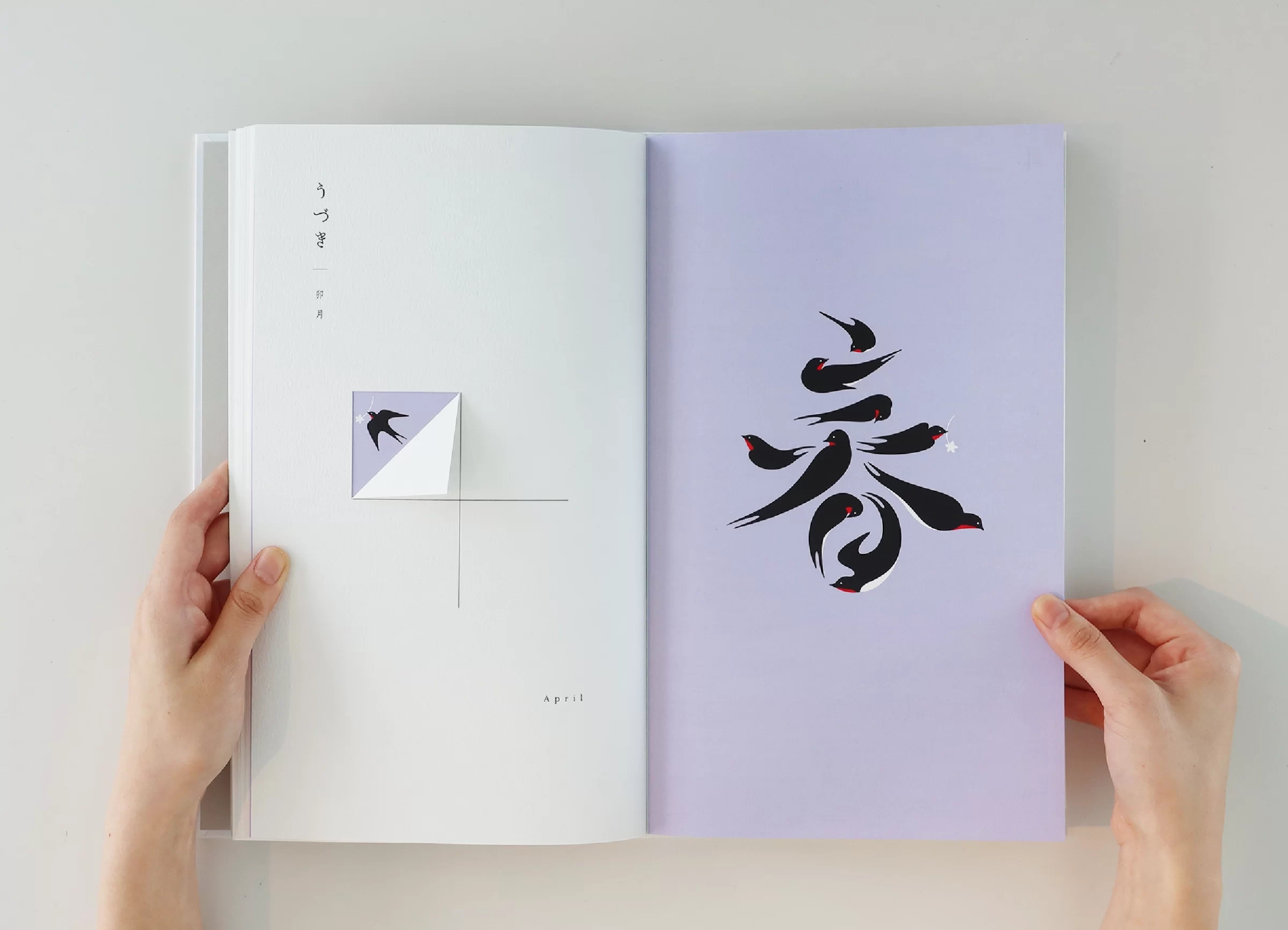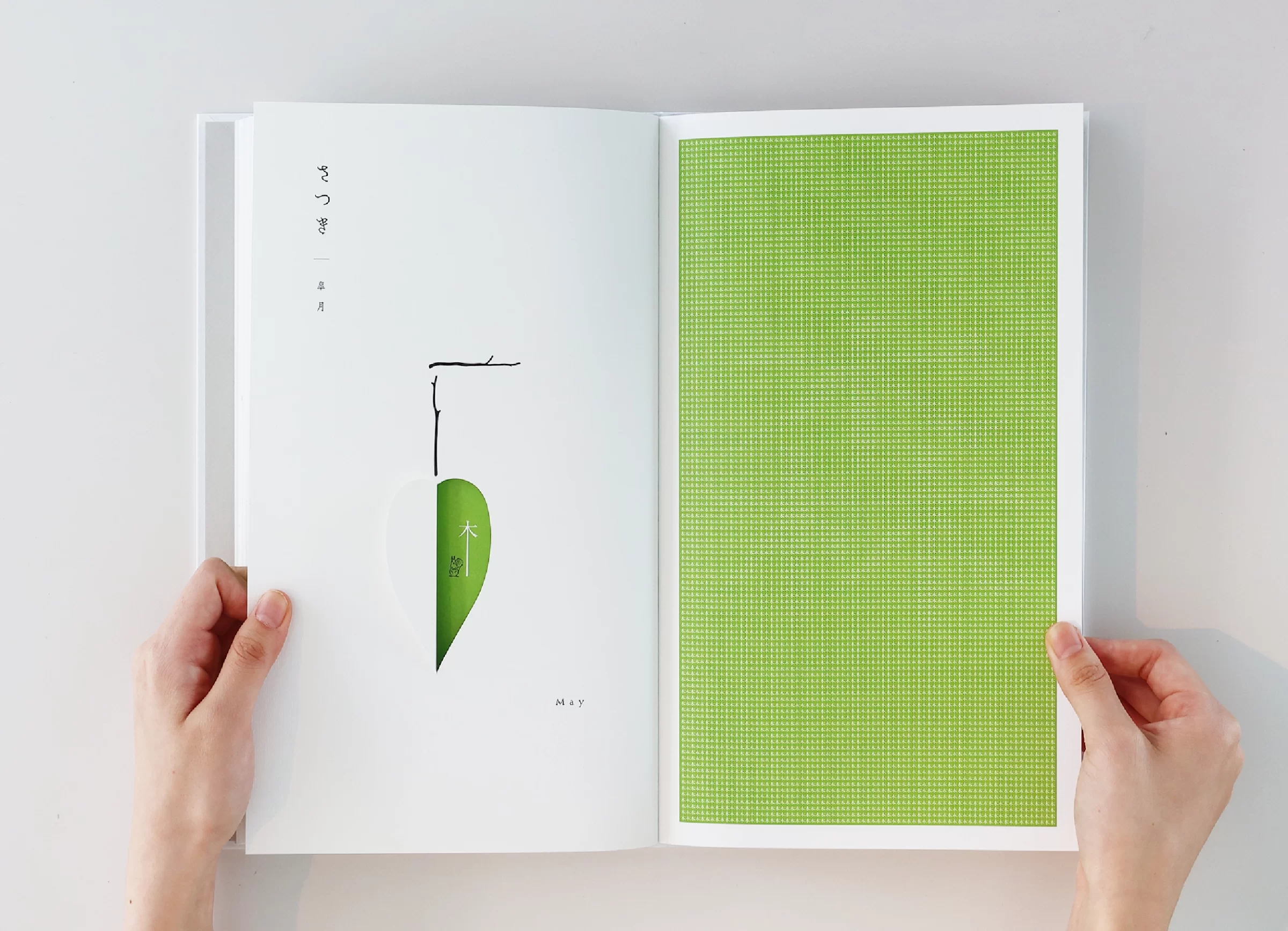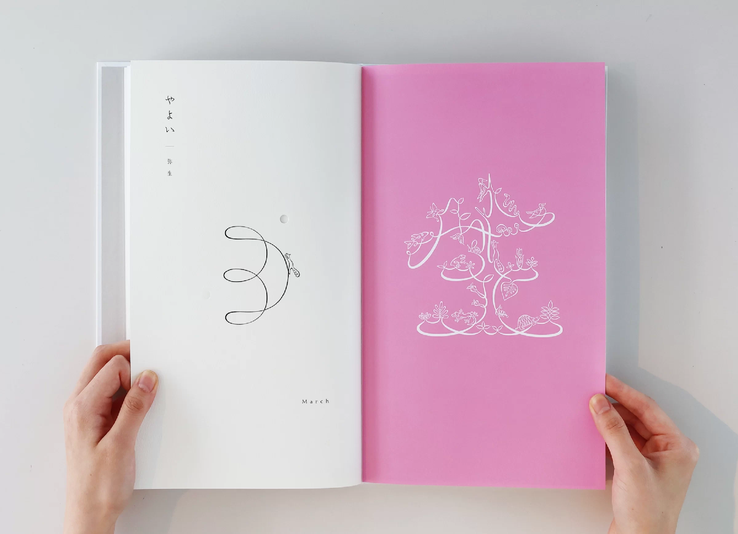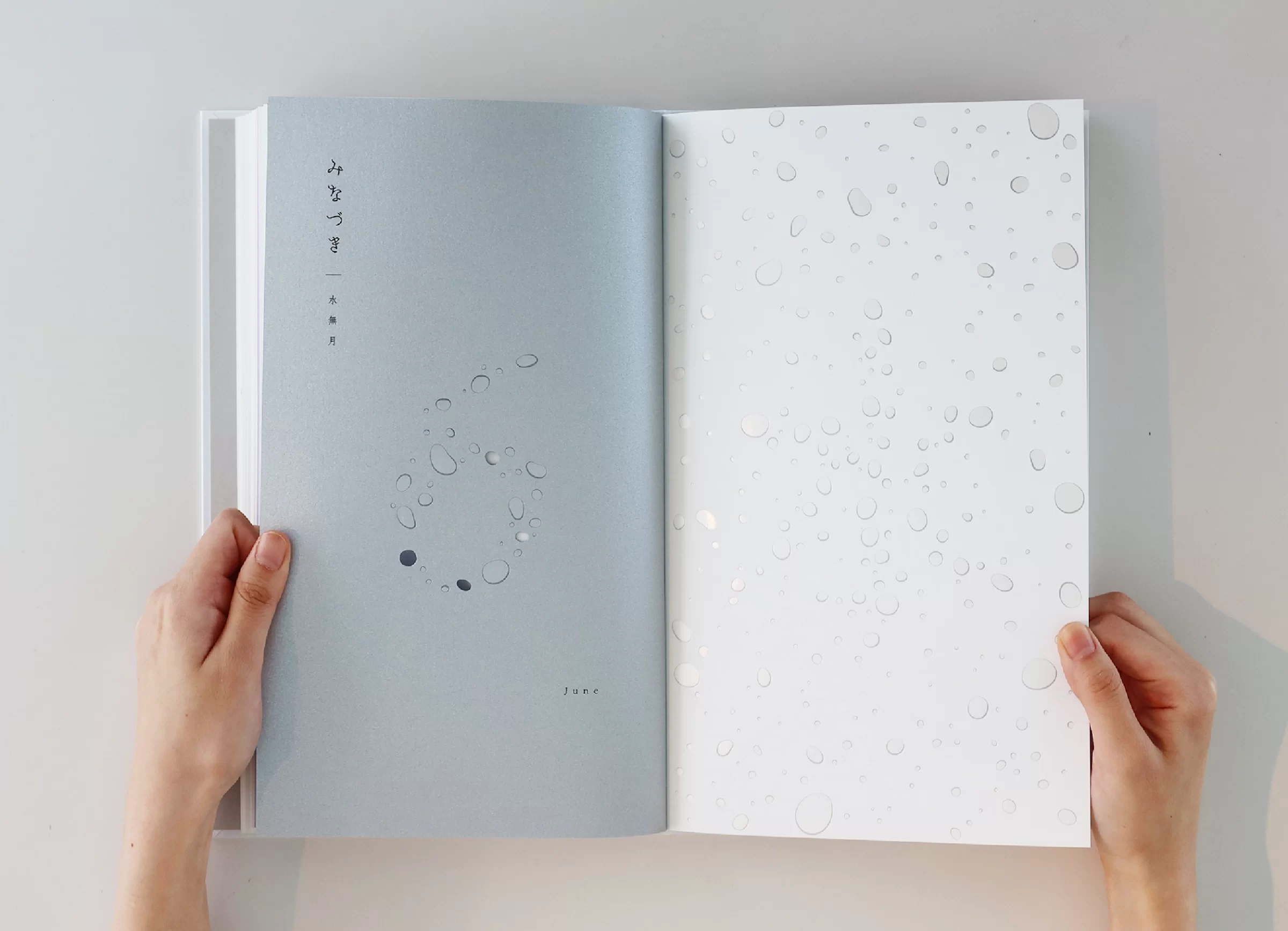 暦は「一日、二日…」と数える「日読み(かよみ)」に由来するといわれています。暦には、天体の運行や天象の予報、日付や曜日、二十四節気、七十二候、六曜、年中行事など、多くの情報が含まれています。ニュースや天気予報で「暦の上では…」という言葉を耳にすることがありますが、その表現からは、移りゆく自然のリズムに寄り添った日本の文化や風習を感じ取ることができます。暦は、いわば「暮らしのものさし」として機能してきたのです。また、暦には占星術や過去の天気情報を独自に組み立てて未来を予測する性質もあり、多面的な視座が重なることで、「暮らしの未来を想像する」浪漫が息づいてきました。2019年の竹尾デスクダイアリーは、日本の文化や風習を紡ぎながら、「毎日をていねいに暮らしていく」日本人の自然観をコンセプトに制作しました。旧暦を拠り所としたタイポグラフィで絵本のような表現を試み、月の扉の一部には、穴を開けるなど次の月へとつながる仕掛けを設け、ページをめくるたびに季節の移ろいを感じられる工夫をしています。また、扉に使用する紙はそれぞれ個性のあるものを選びました。紙の風合いや色、柄は、自然のさまざまな要素をお手本にして作られてきたのではないかと想像したからです。現在使用している紙には化学的な素材も含まれていますが、紙のルーツは植物繊維を原料としており、「植物の遺伝子」を受け継いでいます。「かみ」と「こよみ」から成る「かよみ(日読み)」──このデスクダイアリーは、ていねいに、丹精を込め、暮らしの日々を綴るための一冊です。