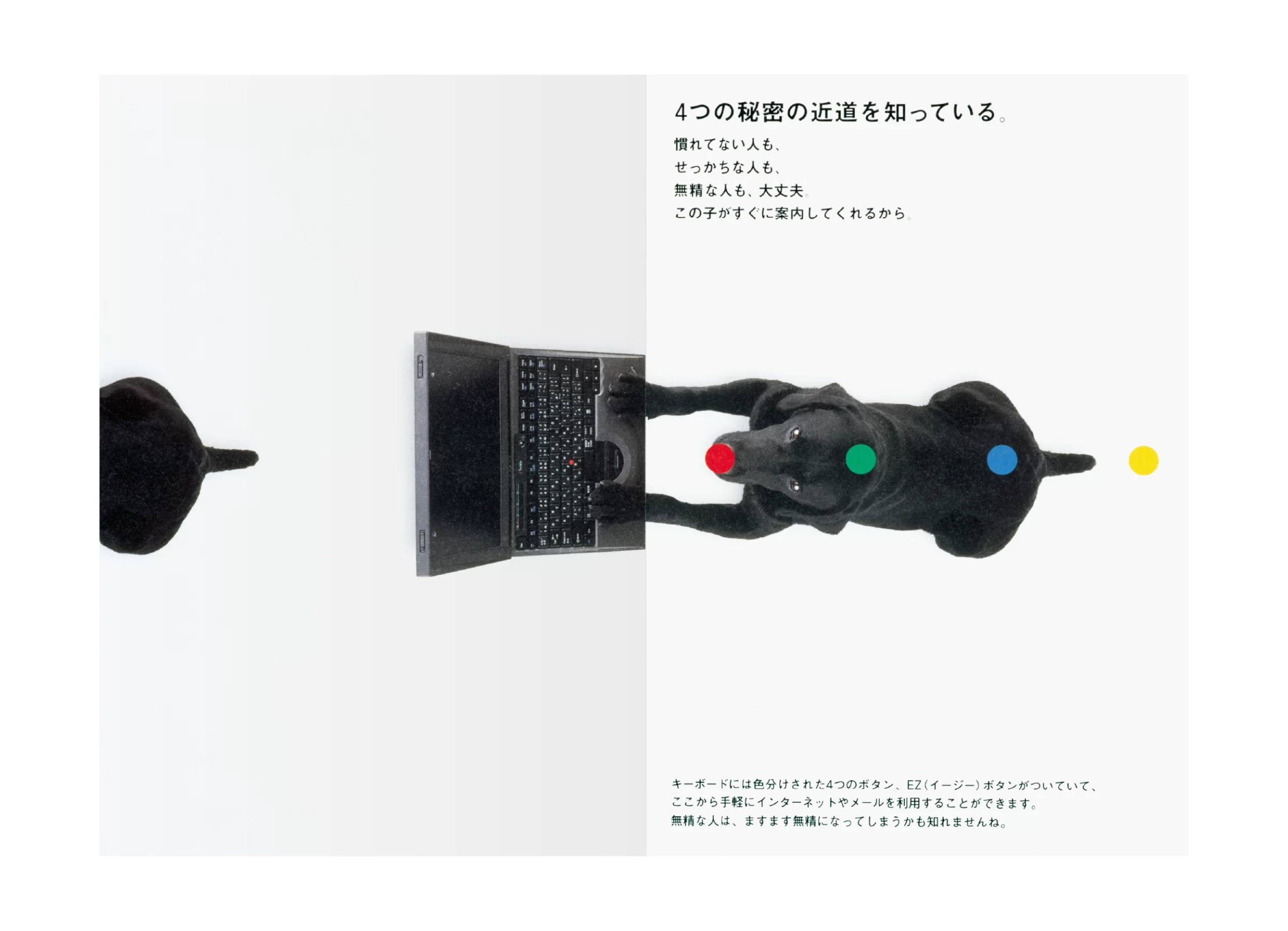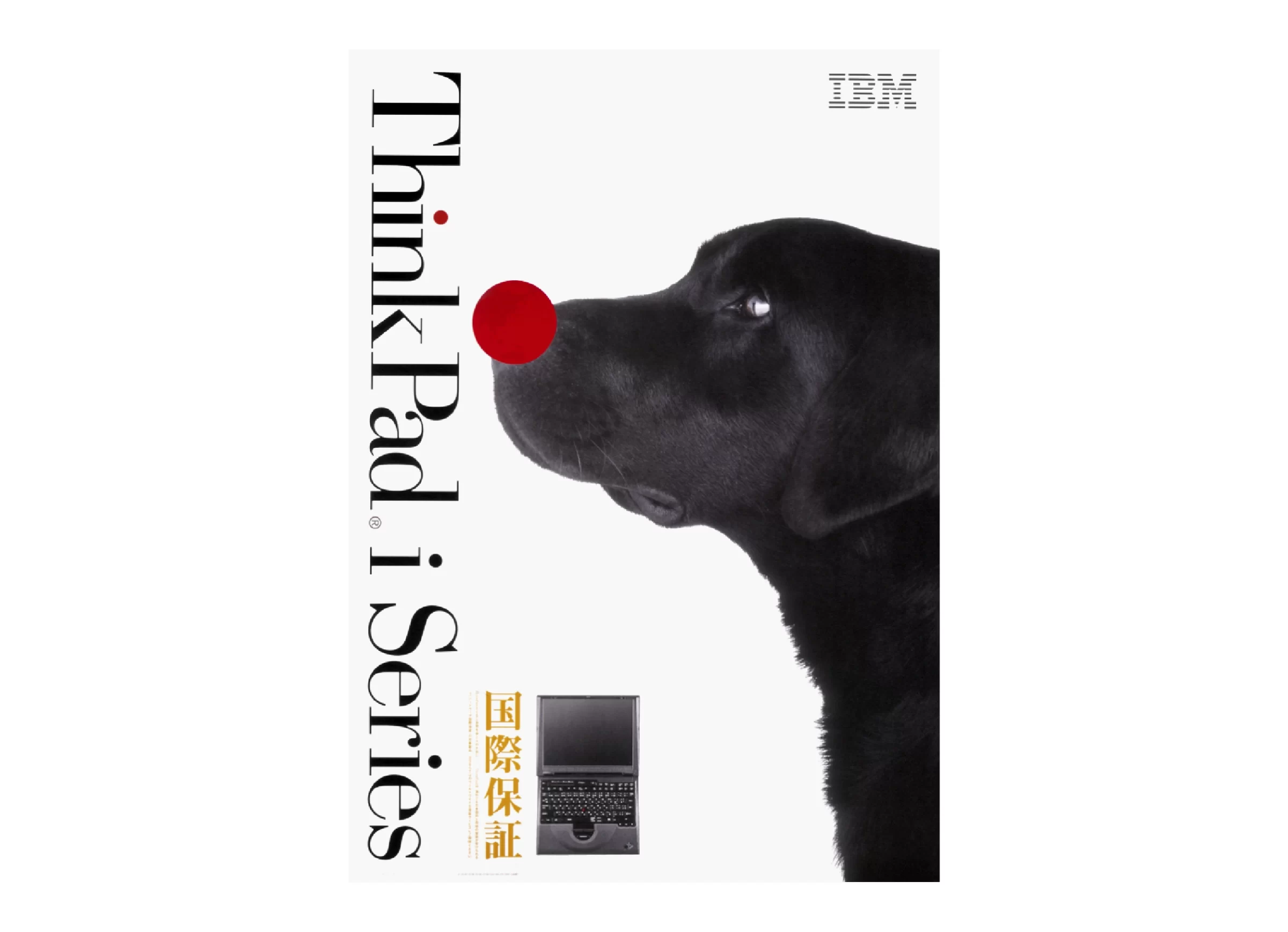 IBMのThinkPadは、もともとビジネスユースで高く評価されてきたパソコンです。しかし、ある時期AppleのiMacがカラフルなデザインで話題になる中、ファッション系の店舗や家庭でもパソコンを使う機会が増えていきました。こうした背景を受け、ThinkPadのユーザーフレンドリーな魅力を、より多くの人に伝える計画が立ち上げられました。その表現手法として、ThinkPadの象徴的な「赤いトラックポイント」を、ラブラドール犬の鼻に見立てました。ピエロの赤い鼻のようなチャーミングさを添えることで、黒いボディの知的で落ち着いた印象に、柔らかな親しみやすさを加えています。赤い鼻のラブラドールのように、ThinkPadは使う人の心に自然に寄り添い、直感的な操作のしやすさを感じさせます。展示では、スクリーンセーバーや画面を活用したモーション・グラフィックスで、賢くユーモラスな犬がThinkPadそのものとして特徴を伝えます。難しい情報もわかりやすく、ユーモアとウィットを交えながら届けることで、まるで話し上手の案内役のように、心地よい笑いとともに情報が届きます。ThinkPad犬は展示でも大人気となり、売り場ではマスコットにリードをつけて遊ぶ光景まで生まれました。合理的で知的な設計と、親しみやすい表現が共存することで、ThinkPadは単なる道具ではなく、人の思考や感覚に寄り添う存在として、広く受け入れられる製品となったのです。