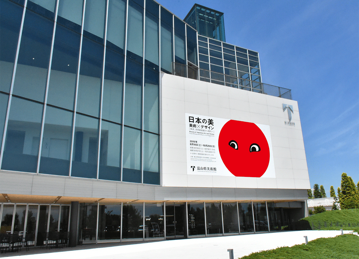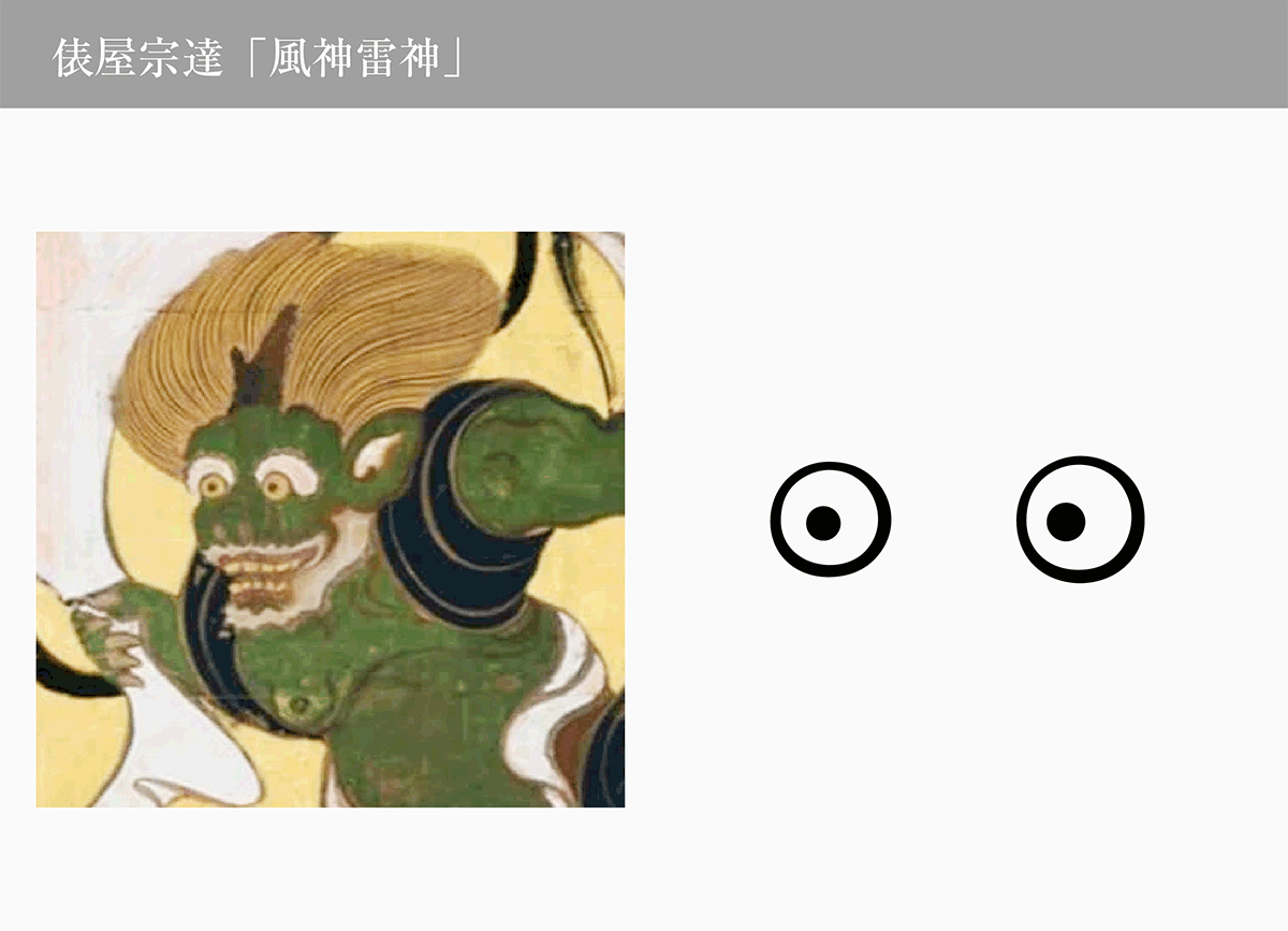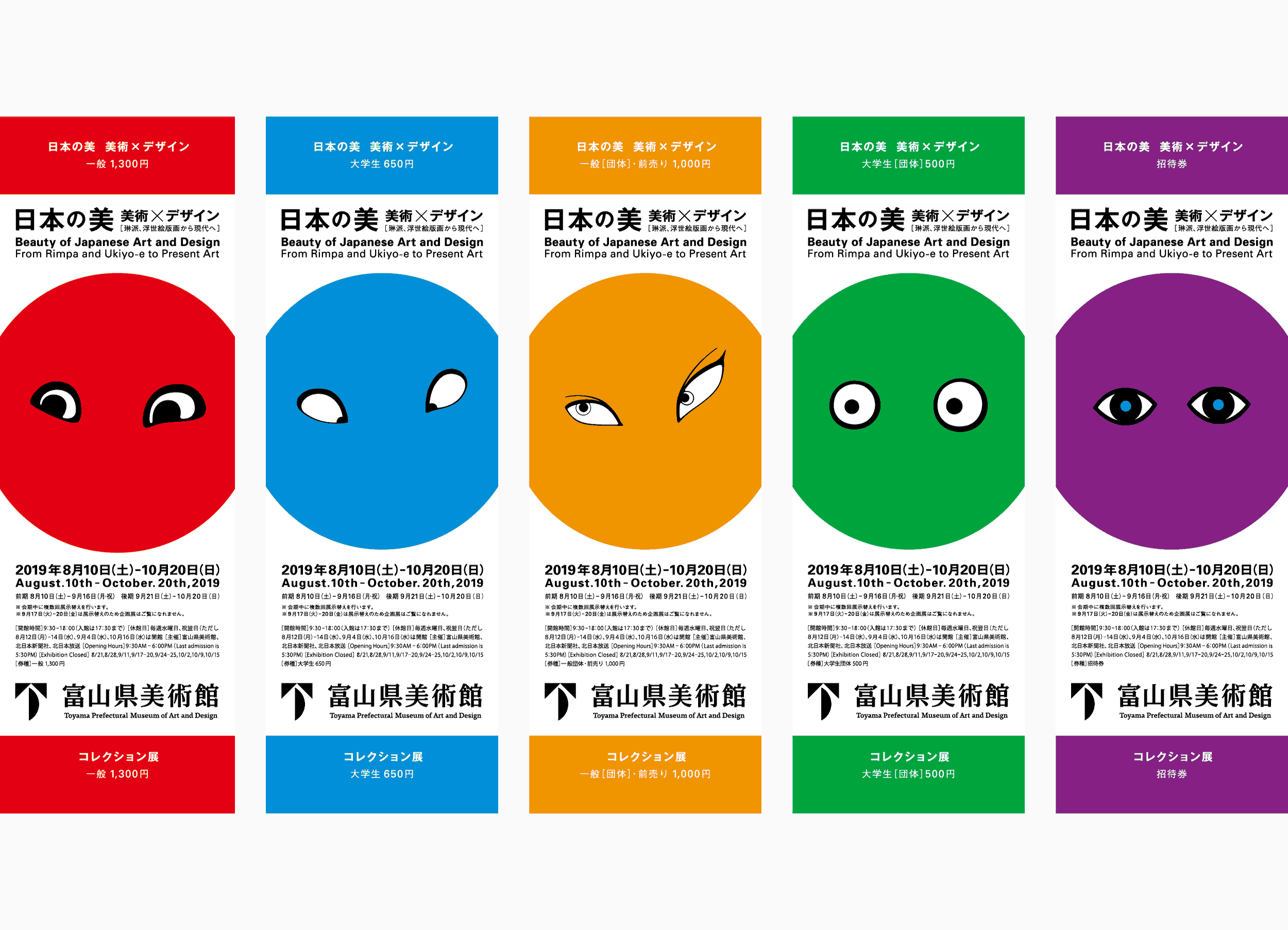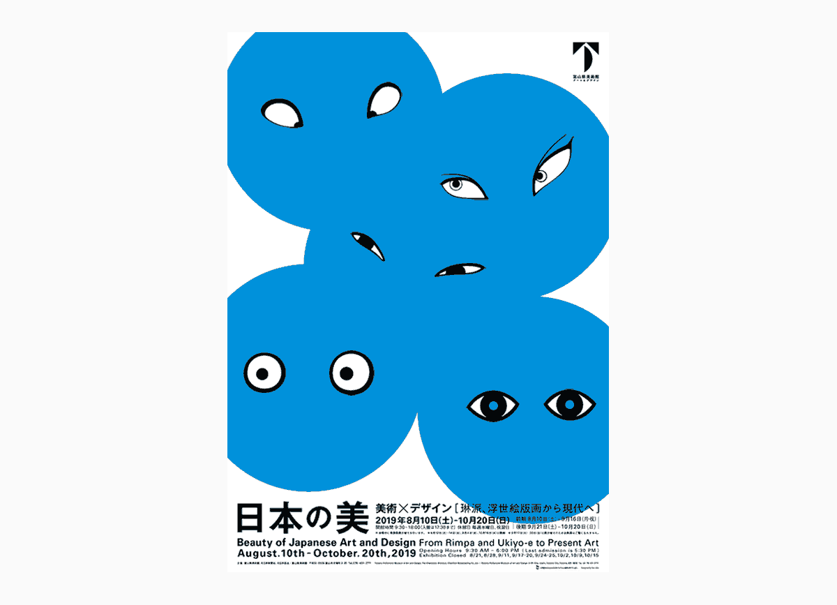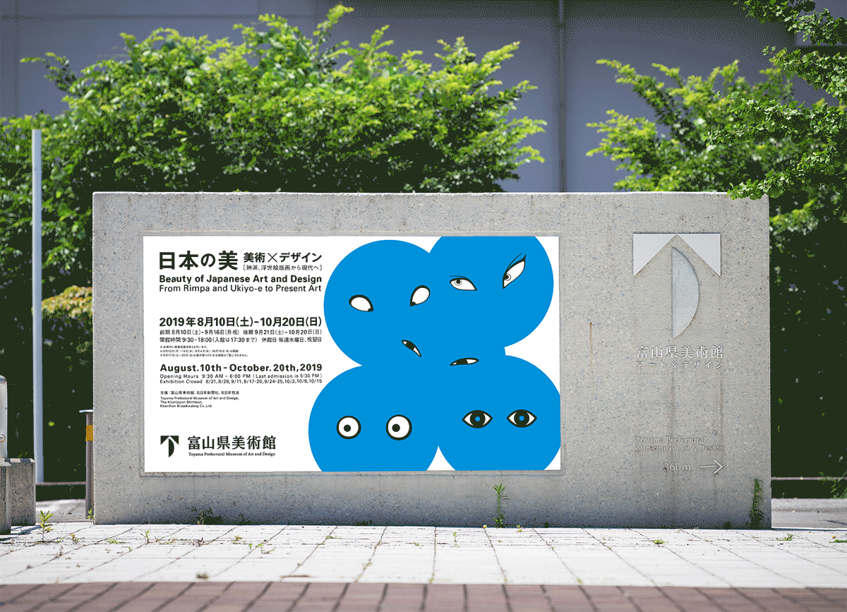 「日本の美 −琳派、浮世絵版画から現代へ−」は、日本の美術に内在する装飾性やデザイン性に着目し、琳派や浮世絵版画から現代絵画、ポスターに至るまで、多様な美のかたちを紹介する展覧会です。琳派の祖・俵屋宗達による《風神雷神図》、そして浮世絵の東洲斎写楽や喜多川歌麿の作品を眺めていると、まず目に飛び込んでくるのは「目」の存在です。ギョロ、ジロッ、シラッ、トローン。そこには驚くほど豊かな表情が宿り、視線だけで感情や物語を語りかけてきます。もし、その「目」だけを切り取って眺めてみたらどうでしょう。途端にそれらは、とてもポップで、現代的な造形として立ち上がってきます。その眼差しの連なりの中に、日本のアニメや漫画、さらには現代美術へとつながる文化の系譜が、ひそやかに息づいているようにも感じられます。長年にわたり富山県美術館のデザインを手がけてきた永井一正さんのポスターを改めて見つめると、そこに描かれた「目」にもまた、日本美術の記憶が脈々と受け継がれていることに気づかされます。時代や表現が変わっても、日本の美は、視線の中に宿り続けているのです。もし、無数の情報が流れるデジタル空間の中で、突然「目」が瞬きをしたとしたら。私たちは思わず立ち止まり、自分が何を見ているのか、問い返すことになるでしょう。このポスターは、日本の美が持ち続けてきた眼差しの力を、現代に呼び戻すための試みです。