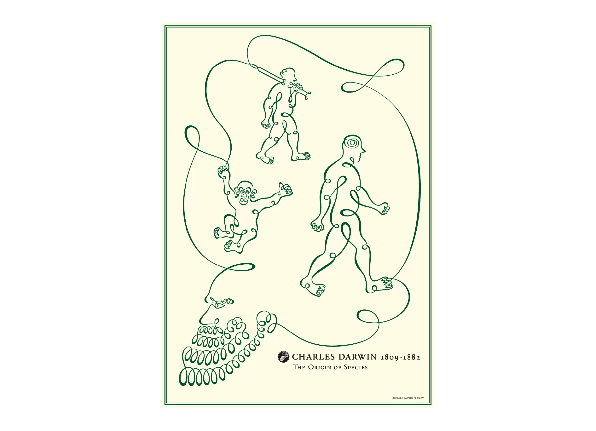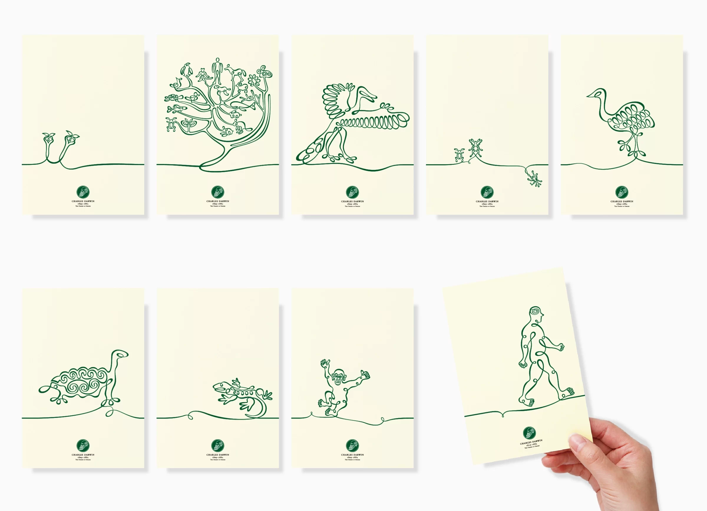 チャールズ・ダーウィン生誕200年を迎えた2008年、自然科学への関心があらためて高まっていました。進化論で知られるダーウィンは、『種の起源』において、自然選択や生存競争といった要因を通じて、生物は環境に適応しながら分岐し、多様な姿へと変化してきたと説いています。生物は決して不変の存在ではなく、長い時間の中で少しずつ姿を変えながら、現在へとつながってきたものなのです。過酷な自然環境の中で淘汰され、選び取られてきたかたち。そう考えると、進化の軌跡は、自然が生み出した「生命のデザイン」とも言えるかもしれません。ここに紹介する葉書サイズのカードとポスターは、ダーウィンの進化論をテーマに制作した作品です。ダーウィンが研究対象とした生物たちを、一筆書きのような抑揚のある一本の線で描き、生命の連なりを可視化しました。カードは、ダーウィンが世界を巡った測量船ビーグル号を含め、12枚でひとつのセットとして構成されています。もし地球の環境条件が、ほんの少しでも異なっていたなら、生物は私たちの知らない、まったく別の進化の道をたどっていたかもしれません。カードを自由に並べ替えながら、想像の中で独自の進化のプロセスを描いてみてください。線と線がつながるたびに、思いがけない物語が立ち上がってきます。もしかすると、あなたの遺伝子を受け継ぐ未知の生命が、遠い未来のどこかで進化を遂げているかもしれません。その頃、地球は、どのような姿で存在しているのでしょうか。