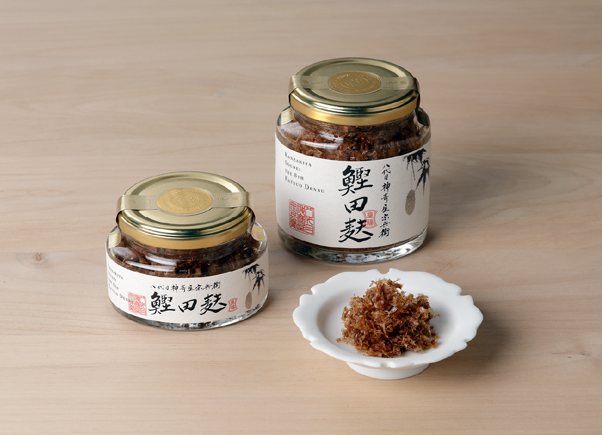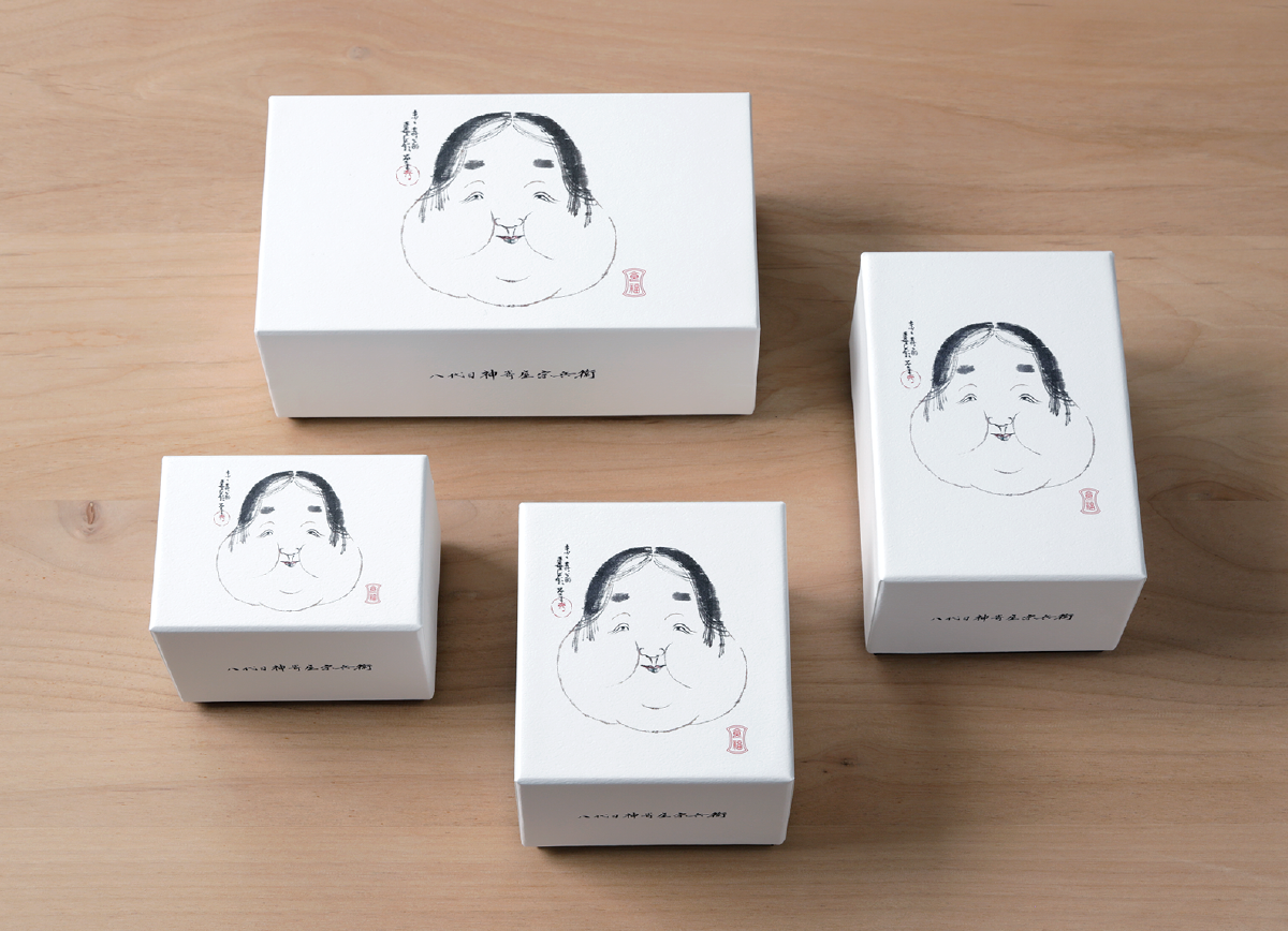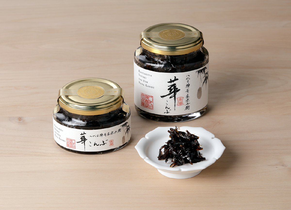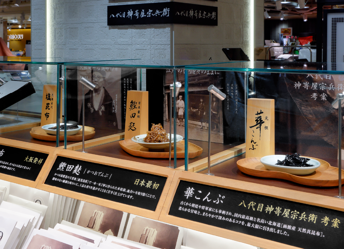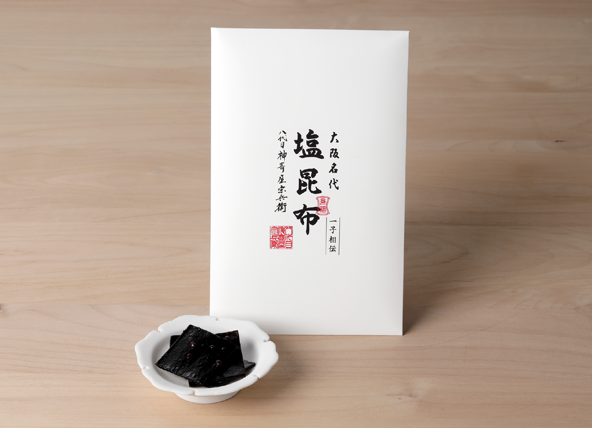 明和年間(1764年)より、大阪のやさしい味を守り続けてきた神嵜屋宗兵衛商店は、昆布匠として260年以上にわたり、代々の技と精神を受け継いできました。八代目のもとで展開されるブランディングは、従来の枠に留まるものではなく、パーパスを軸に、社会から「あってよかった」と言っていただける存在意義を体現する活動として設計されています。一子相伝の技で作り出される味覚は、他には再現できない独自性を持ちます。代表商品は、北海道函館産天然真昆布を用いたコク深い甘辛さの「華昆布」、伝統の手もみ技を未来へつなぐ「鰹田麩(かつおでんぶ)」、そして大阪名代のやさしい味を八代目が考案した「塩昆布」です。鍋から商品に直接触れるパッケージはすべてアルミフリーとし、健康への徹底した配慮を示しています。この細部に宿る理念は、まさに「あってよかったブランド」としての気概を示しています。長い歴史を重ねた神嵜屋宗兵衛には、代々受け継がれる家宝が数多く残されています。ある日、八代目が蔵の整理をしていると、「背に『おたふく』、前に『笹と小判』の絵が描かれた袖なし羽織」を見つけました。カラフルな唇の描写はアバンギャルドな趣を湛え、裏地には微かに白地の「松竹梅」が浮かびます。この家宝を軸に、ブランディングは新たな物語として再構築をしていきます。「食福」をコンセプトに、「おたふく」はパッケージに、「笹と小判」はラベルに、「松竹梅」は包装紙に配置。歴史と文化を未来へとつなぐデザインとして、260年以上の技と理念を尊重しつつ、現代に生きる神嵜屋宗兵衛の存在意義を静かに示しています。