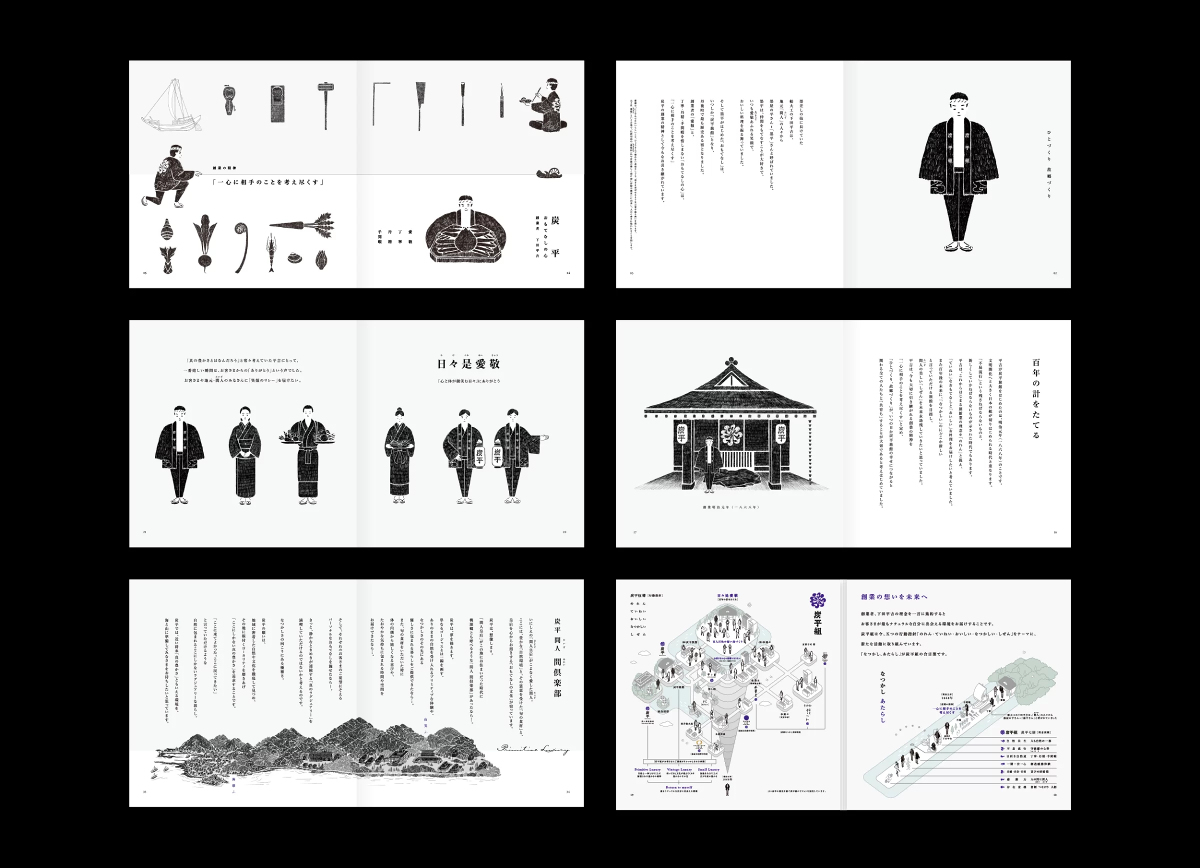 Works Branding 株式会社 炭平組 Works一覧へClient別一覧へ 残すものと 新しくするもの 「炭平旅館」ブランディング Concept 炭平旅館は、京丹後、間人(たいざ)に明治元年創業の老舗旅館です。リ・ブランディングで大切にしたのは、残すものと、新しくするものの「不易流行」をしっかりと見極めながらコンセプトを組み立てることです。ブランディングを人に比喩すると、理念をわかりやすく内外に伝える「心づくり」と、理念を見える化させる「顔づくり」と、理念を体験的価値へとつないでいく「体づくり」の3つに区分することができます。ここでの「心づくり」は、理念を継承する「のれん」、丹精や手間暇を忘れない「ていねい」な振る舞い、旬の恵みをお届けする「おいしい」へのこだわり、ほのぼのとした「なつかしい」心の拠り所、間人(たいざ)の尊い「しぜん」を守り続ける環境への畏敬など「炭平伍導」を設定していきました。そして、むずかしいことをわかりやすく紐解く「炭平物語」という絵本を作り、お客さまや社員にわかりやすく炭平の考えを伝えていきました。「顔づくり」は、多様に使用されていた「炭平」の文字を新たに組み立て、さらに揺らぎをテーマとするシンボルマーク(紋)を設定することで、理念や行動規範を視覚的に象徴づけたことです。そして、「体づくり」は、茶の湯の「利休七則」にならい、7つの行動規範を設定し、具体的な体験的価値へとサービスを展開させていきました。その「炭平」ならではの価値を見える化させたのが、城島という国定公園の中にある2邸のヴィラ(villa)の価値を写真と言葉で綴るコンセプトブックに仕上げたことです。ブランディングは、単にビジュアルを作るといった一過性のものではありません。経営哲学を「不易流行」の思想に照らし、見える化させる活動です。 Credits 2025年 Art direction: Ken Miki Graphic Design: Ken Miki, Yoko Inuyama, Takeshi Sato, Saya Fukui, Fuu Arakawa Illustration: Takeshi Sato Photo: Toshihiko Murakami Space Design: Akitoshi Imafuku (Supermaniac inc.) 炭平組 https://sumiheigumi.co.jp